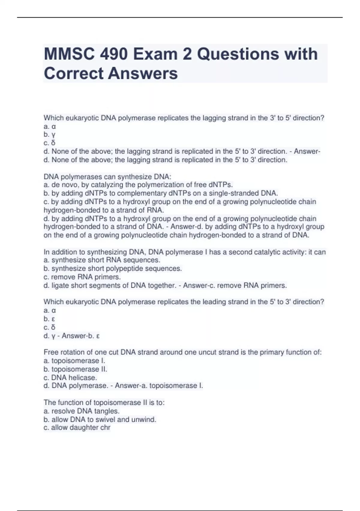 MMSC 490 Exam 2 Questions with Correct Answers Which eukaryotic DNA polymerase replicates the lagging strand in the 3ʹ to 5ʹ direction? a. α b. γ c. δ d. None of the above; the lagging strand is replicated in the 5ʹ to 3ʹ direction. - Answerd. None of the above; the lagging strand is replicated in the 5ʹ to 3ʹ direction. DNA polymerases can synthesize DNA: a. de novo, by catalyzing the polymerization of free dNTPs. b. by adding dNTPs to complementary dNTPs on a single-stranded DNA. c. by adding dNTPs to a hydroxyl group on the end of a growing polynucleotide chain hydrogen-bonded to a strand of RNA. d. by adding dNTPs to a hydroxyl group on the end of a growing polynucleotide chain hydrogen-bonded to a strand of DNA. - Answer-d. by adding dNTPs to a hydroxyl group on the end of a growing polynucleotide chain hydrogen-bonded to a strand of DNA. In addition to synthesizing DNA, DNA polymerase I has a second catalytic activity: it can a. synthesize short RNA sequences. b. synthesize short polypeptide sequences. c. remove RNA primers. d. ligate short segments of DNA together. - Answer-c. remove RNA primers. Which eukaryotic DNA polymerase replicates the leading strand in the 5ʹ to 3ʹ direction? a. α b. ε c. δ d. γ - Answer-b. ε
