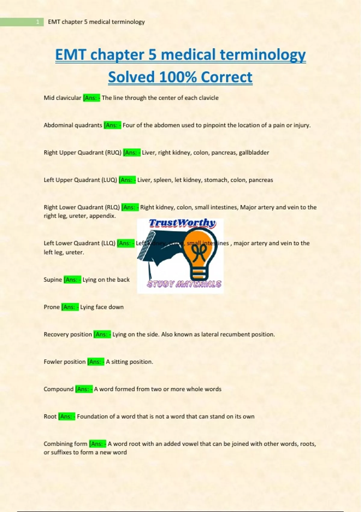 EMT chapter 5 medical terminology Solved 100% Correct,EMT chapter 5 medical terminology Solved 100% Correct,EMT chapter 5 medical terminology Solved 100% Correct