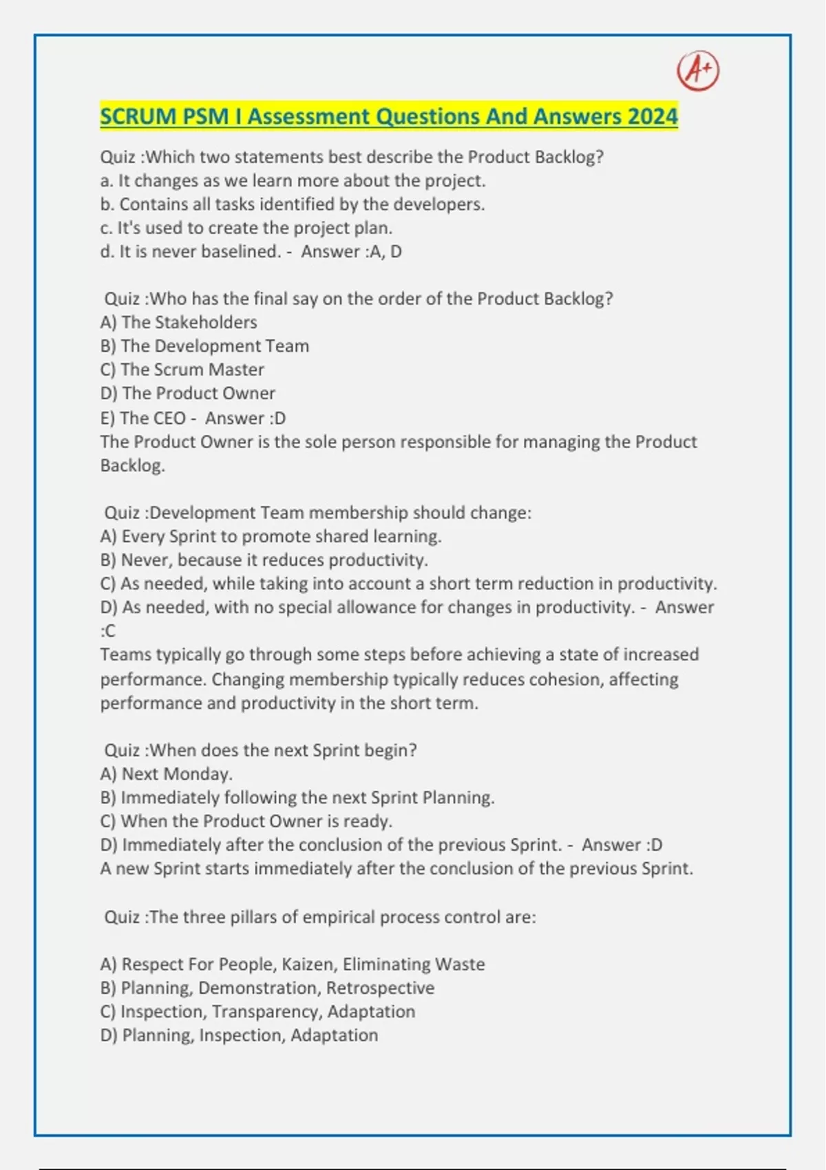 SCRUM PSM I Assessment Questions And Answers 2024