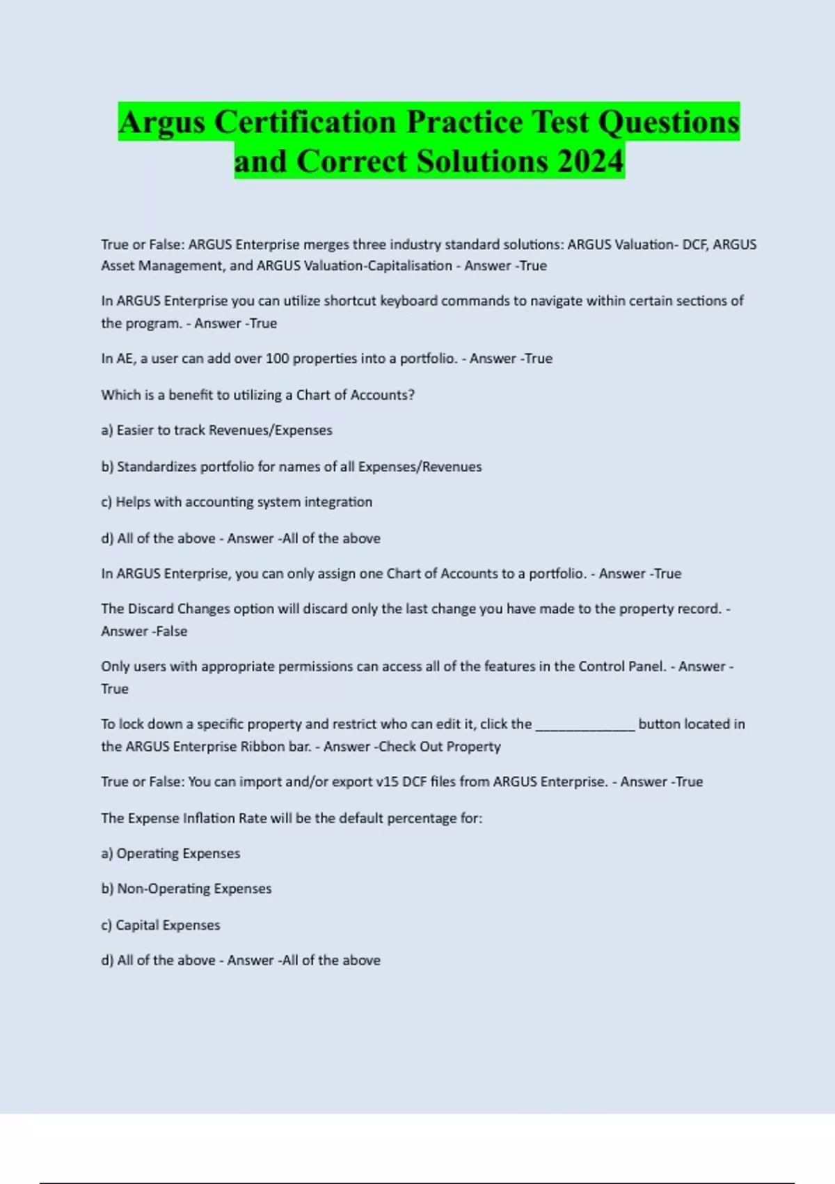 Argus Certification Practice Test Questions and Correct Solutions 2024 True or False: ARGUS Enterprise merges three industry standard solutions: ARGUS Valuation- DCF, ARGUS Asset Management, and ARGUS Valuation-Capitalisation - Answer -True In ARGUS Enterprise you can utilize shortcut keyboard commands to navigate within certain sections of the program. - Answer -True In AE, a user can add over 100 properties into a portfolio. - Answer -True Which is a benefit to utilizing a Chart of Accounts? a) Easier to track Revenues/Expenses b) Standardizes portfolio for names of all Expenses/Revenues c) Helps with accounting system integration d) All of the above - Answer -All of the above In ARGUS Enterprise, you can only assign one Chart of Accounts to a portfolio. - Answer -True The Discard Changes option will discard only the last change you have made to the property record. - Answer -False Only users with appropriate permissions can access all of the features in the Control Panel. - Answer - True To lock down a specific property and restrict who can edit it, click the _____________ button located in the ARGUS Enterprise Ribbon bar. - Answer -Check Out Property True or False: You can import and/or export v15 DCF files from ARGUS Enterprise. - Answer -True The Expense Inflation Rate will be the default percentage for: a) Operating Expenses b) Non-Operating Expenses