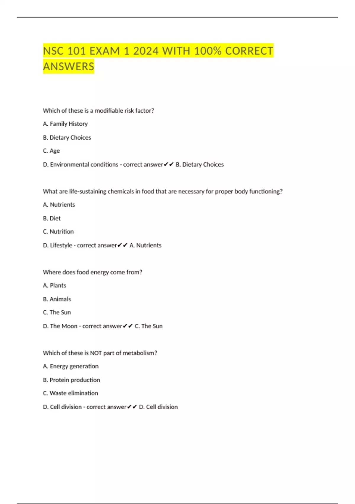 NSC 101 EXAM 1 2024 WITH 100% CORRECT ANSWERS Which of these is a modifiable risk factor? A. Family History B. Dietary Choices C. Age D. Environmental conditions - correct answer B. Dietary Choices What are life-sustaining chemicals in food that are necessary for proper body functioning? A. Nutrients B. Diet C. Nutrition D. Lifestyle - correct answer A. Nutrients Where does food energy come from? A. Plants B. Animals C. The Sun D. The Moon - correct answer C. The Sun Which of these is NOT part of metabolism? A. Energy generation B. Protein production