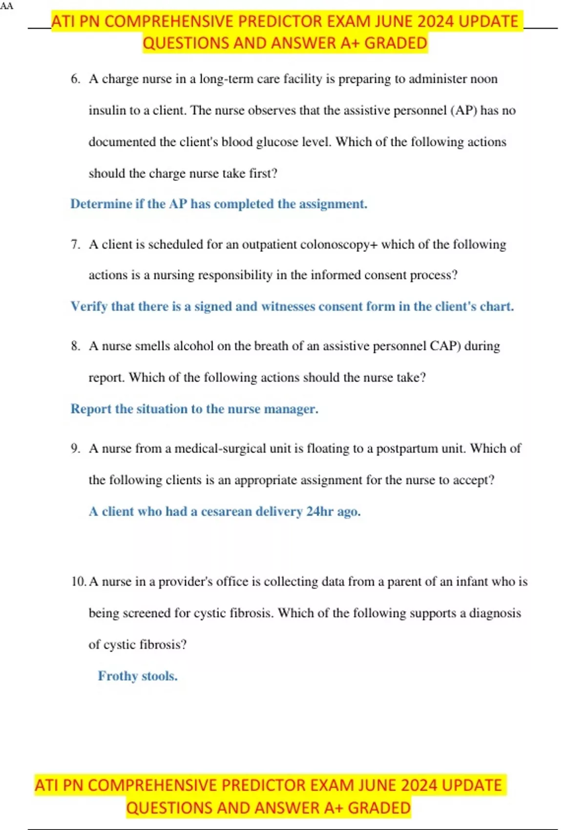 ATI PN COMPREHENSIVE PREDICTOR EXAM JUNE 2024 UPDATE QUESTIONS AND ANSWER A+ GRADED