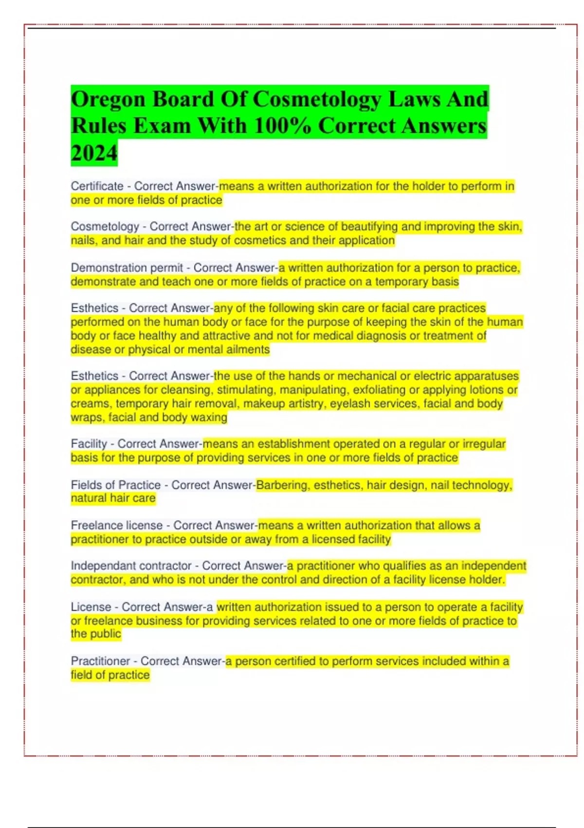 Oregon Board Of Cosmetology Laws And Rules Exam With 100% Correct Answers 2024 Certificate - Correct Answer-means a written authorization for the holder to perform in one or more fields of practice Cosmetology - Correct Answer-the art or science of beautifying and improving the skin, nails, and hair and the study of cosmetics and their application Demonstration permit - Correct Answer-a written authorization for a person to practice, demonstrate and teach one or more fields of practice on a temporary basis Esthetics - Correct Answer-any of the following skin care or facial care practices performed on the human body or face for the purpose of keeping the skin of the human body or face healthy and attractive and not for medical diagnosis or treatment of disease or physical or mental ailments Esthetics - Correct Answer-the use of the hands or mechanical or electric apparatuses or appliances for cleansing, stimulating, manipulating, exfoliating or applying lotions or creams, temporary hair removal, makeup artistry, eyelash services, facial and body wraps, facial and body waxing