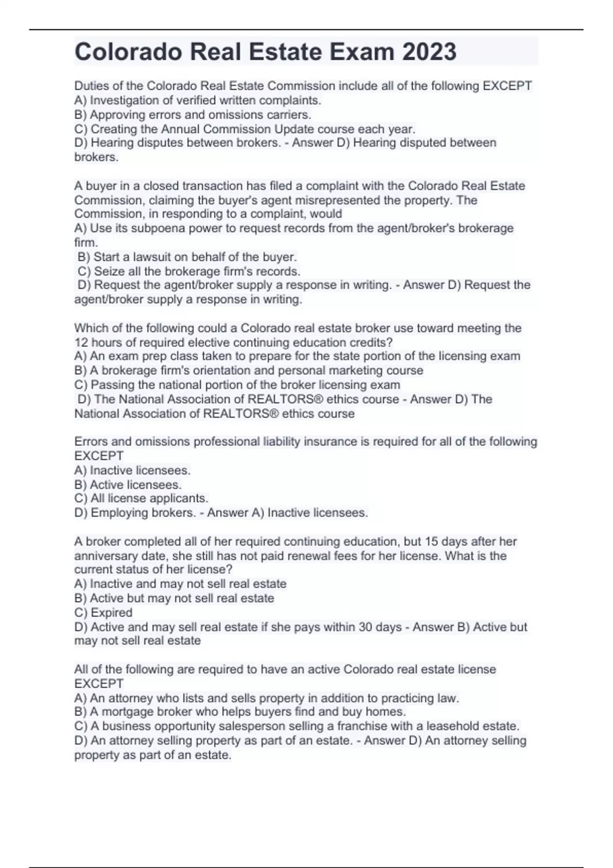 Colorado Real Estate Exam 2023.