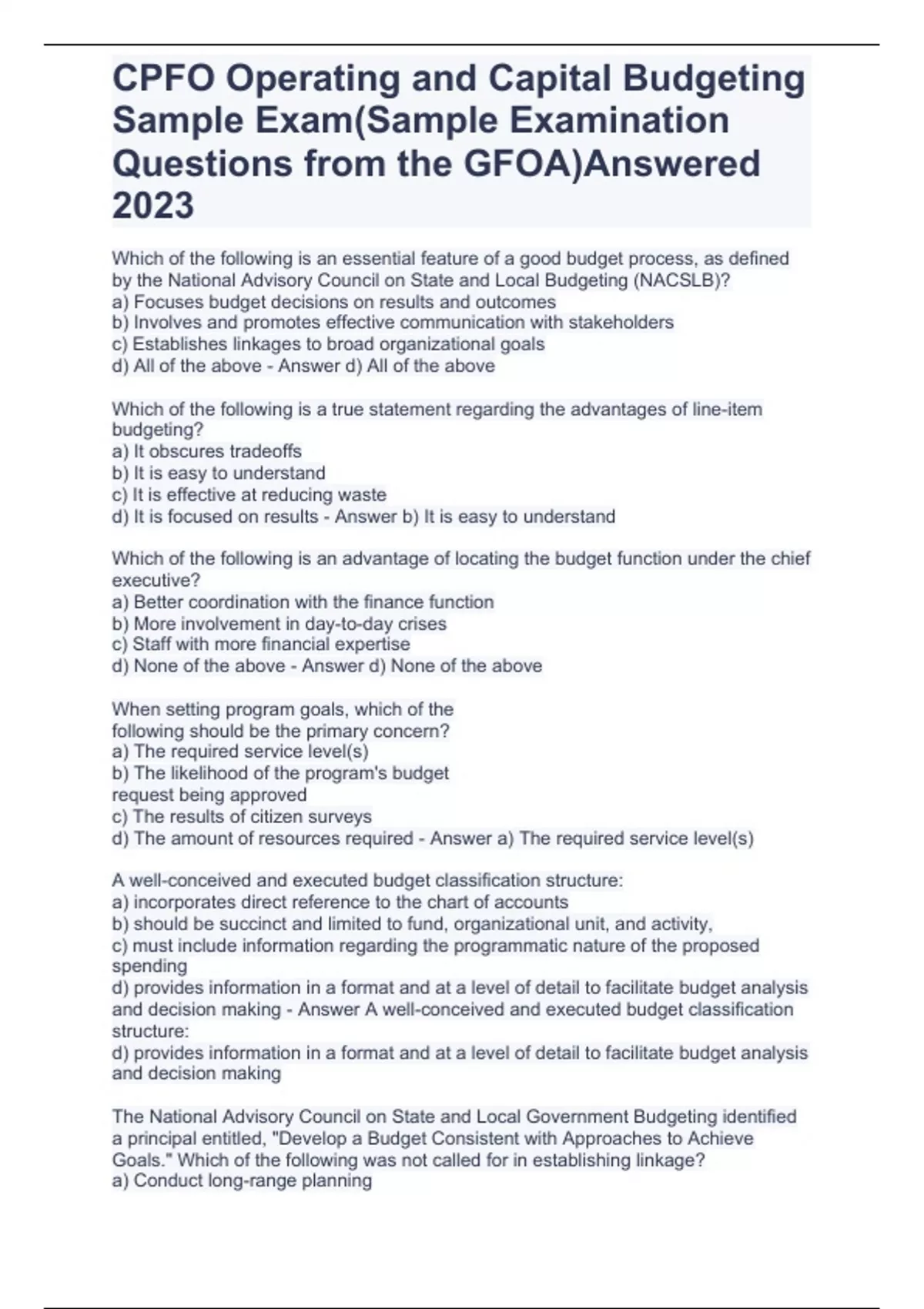 CPFO Operating and Capital Budgeting Sample Exam(Sample Examination Questions from the