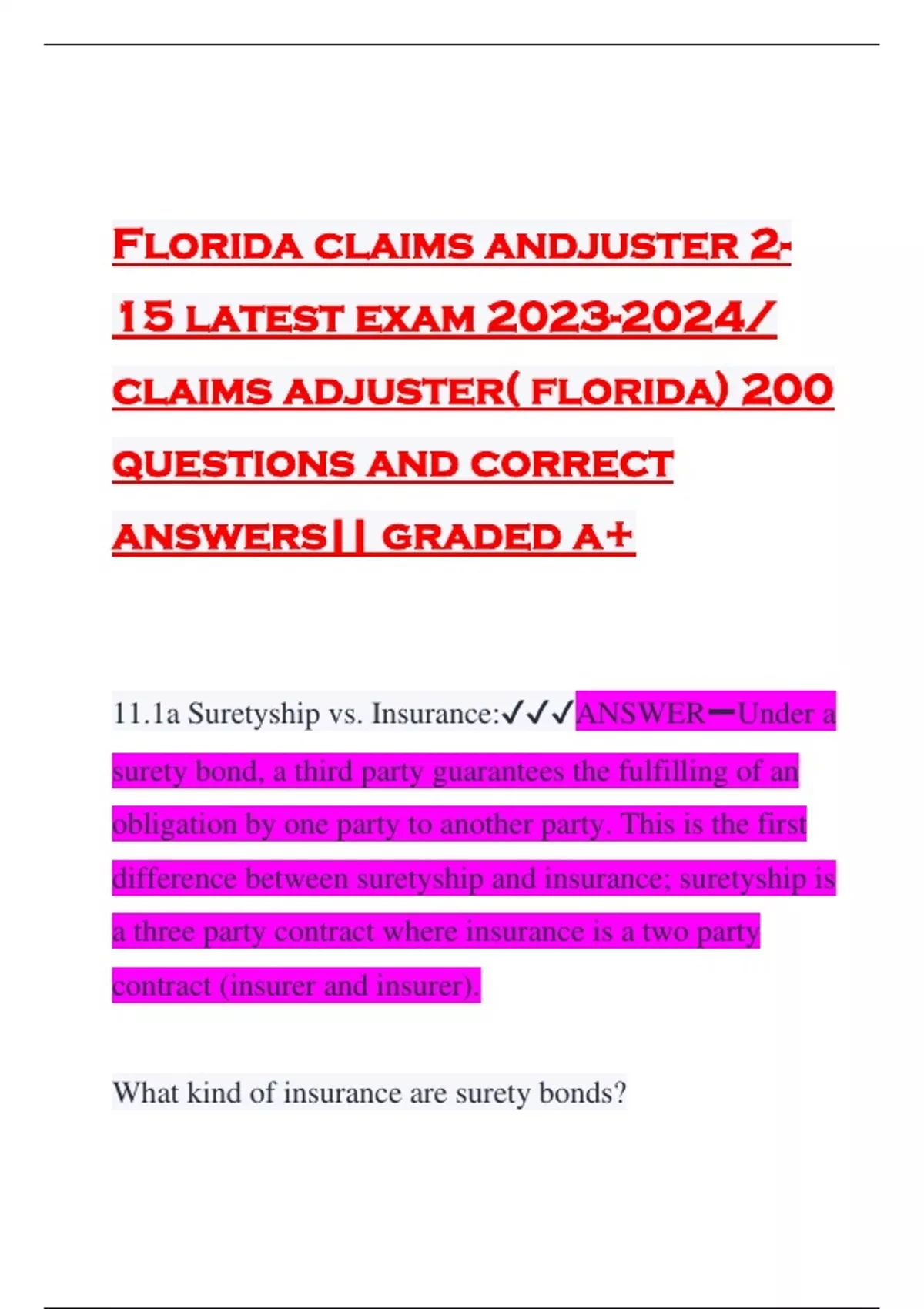 Florida claims andjuster 2- 15 latest exam / claims adjuster( florida) 200 questions and correct answers|| graded a+ 11.1a Suretyship vs. Insurance:ANSWERUnder a surety bond, a third party guarantees the fulfilling of an obligation by one party to another party. This is the first difference between suretyship and insurance; suretyship is a three party contract where insurance is a two party contract (insurer and insurer). What kind of insurance are surety bonds? Surety