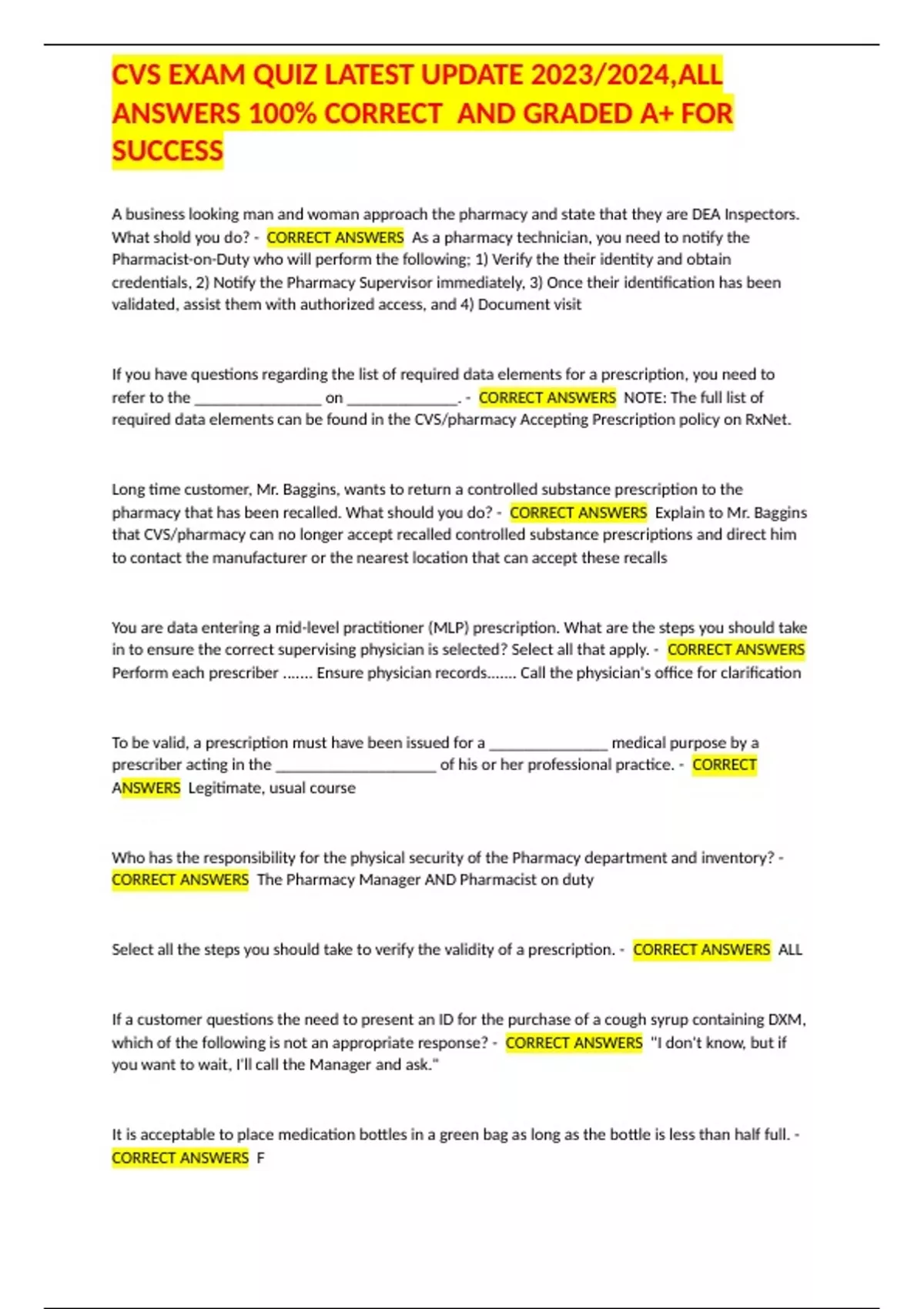 CVS EXAM QUIZ LATEST UPDATE 2023/2024,ALL ANSWERS 100% CORRECT AND GRADED A+ FOR SUCCESS