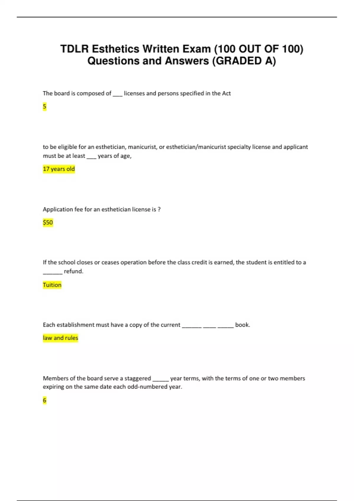 TDLR Esthetics Written Exam (100 OUT OF 100) Questions and Answers (GRADED A).