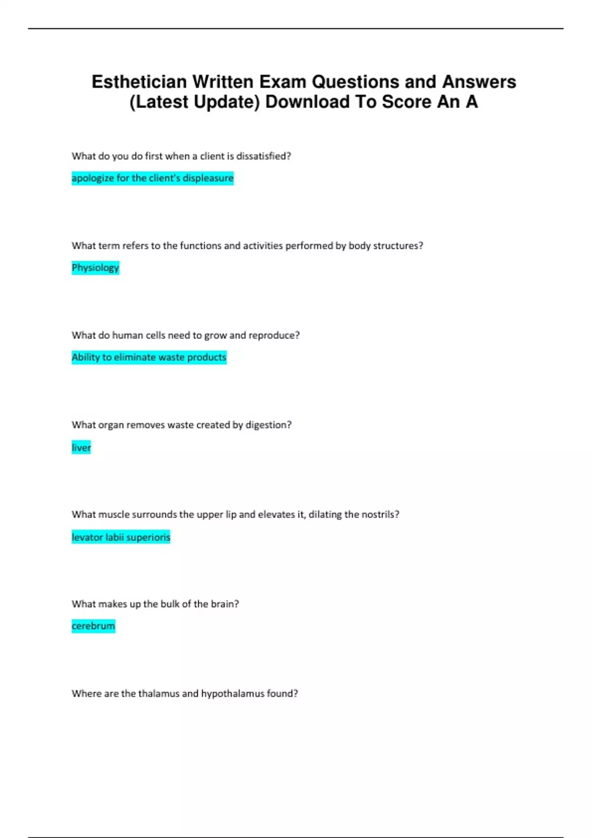sthetician Written Exam Questions and Answers (Latest Update) Download To Score An A.