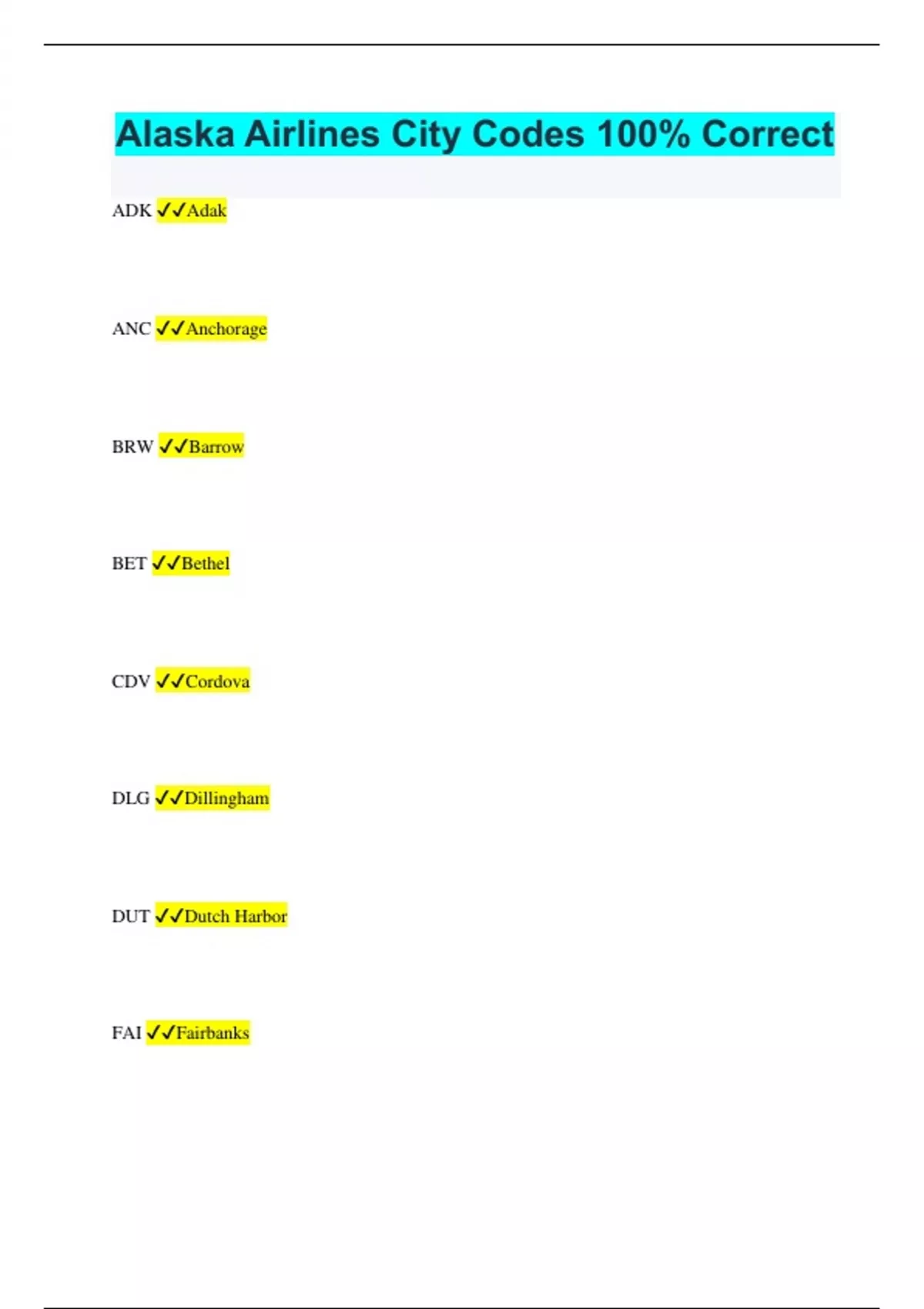 Alaska Airlines City Codes 100% Correct ADK Adak ANC Anchorage BRW Barrow BET Bethel CDV Cordova DLG Dillingham DUT Dutch Harbor FAI Fairbanks GST Gustavus JNU Juneau KTN Ketchikan AKN King Salmon ADQ Kodiak OTZ Kotzebue OME Nome PSG Petersburg SCC Prudhoe Bay SIT Sitka WRG Wrangell YAK Yakutat