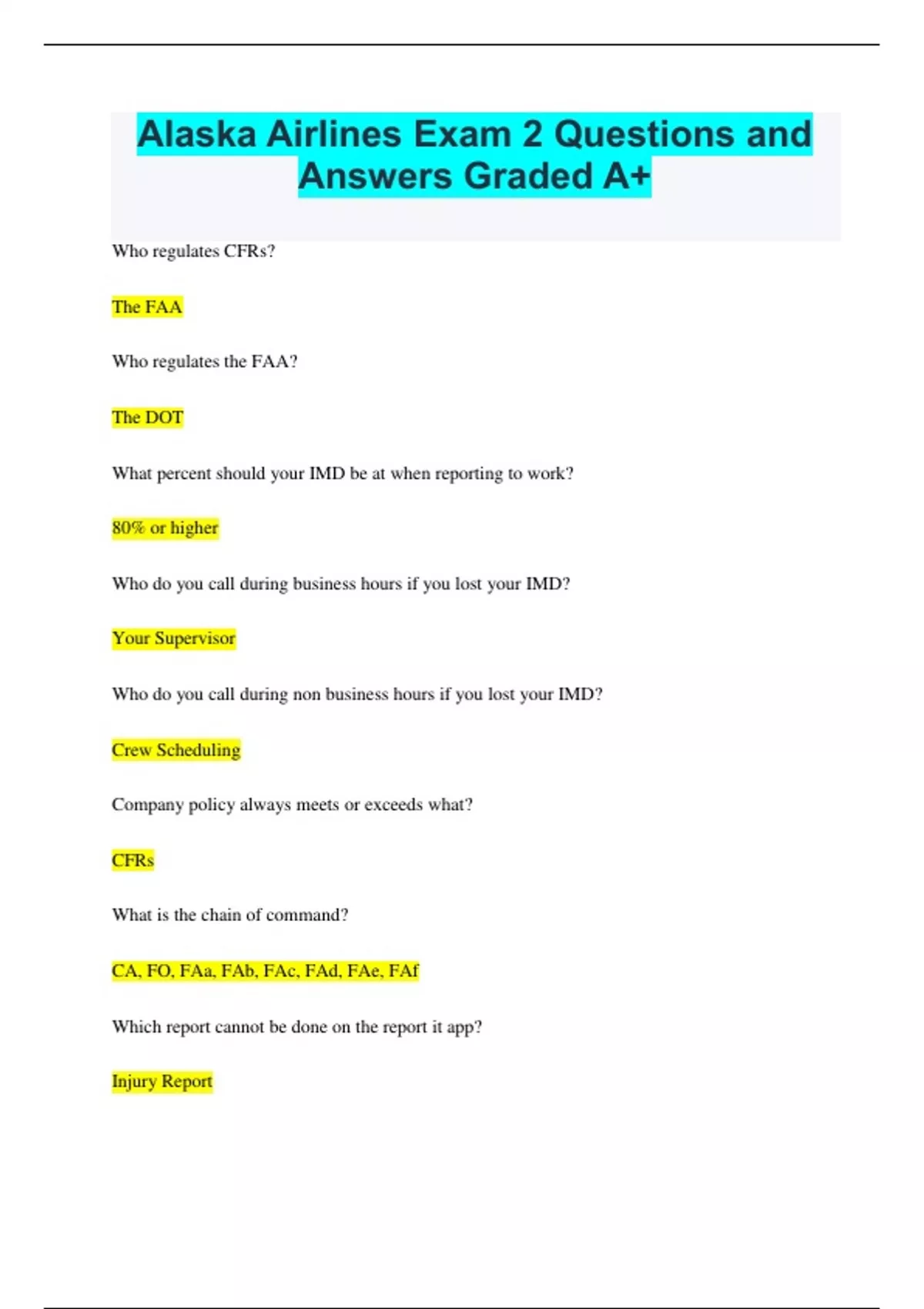 Alaska Airlines Exam 2 Questions and Answers Graded A+ Who regulates CFRs? The FAA Who regulates the FAA? The DOT What percent should your IMD be at when reporting to work? 80% or higher Who do you call during business hours if you lost your IMD? Your Supervisor Who do you call during non business hours if you lost your IMD? Crew Scheduling Company policy always meets or exceeds what? CFRs What is the chain of command? CA, FO, FAa, FAb, FAc, FAd, FAe, FAf Which report cannot be done on the report it app? Injury Report ASAP Aviation Safety Action Program Report FIR Irregulary Report What is an ASAP report? A voluntary disclose of safety hazards while not being able to get in trouble When should you file an ASAP report? When you are not in compliance due to forgetting or due to a safety concern When does an ASAP report need to be submitted? Within 24 hours after the end of your trip When does and FIR report need to be submitted? Within 24 hours after end of your trip When does FIR reports involving alcohol need to be submitted? Within 24 hours of the event occurrence Examples of FIR reports Guest incidents, medical emergencies, security, emergency situation, smoking, and alcohol Who needs to submit an FIR report? All of the crew members involved in the situation What types of animals are permitted as a PETC? Dogs, cats, rabbits, and birds PETC Pet in Cabin How many PETC can be in the main cabin? 5 How many PETC can be in first class? 1 SVAN Service Animal What type of animal is a SVAN? Dog How many SVAN can each person have? 2 How many SVAN are allowed in the entire cabin? Unlimited At what stage of flight can you charge your