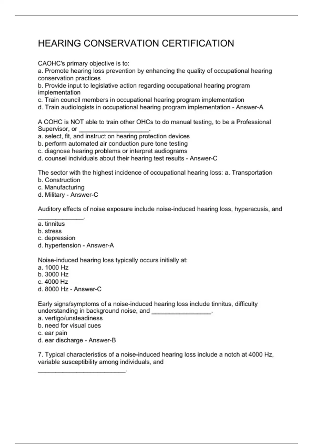 CAOHC's primary objective is to: a. Promote hearing loss prevention by enhancing the quality of occupational hearing conservation practices b. Provide input to legislative action regarding occupational hearing program implementation c. Train council members in occupational hearing program implementation d. Train audiologists in occupational hearing program implementation - Answer-A A COHC is NOT able to train other OHCs to do manual testing, to be a Professional Supervisor, or ____________________. a. select, fit, and instruct on hearing protection devices b. perform automated air conduction pure tone testing c. diagnose hearing problems or interpret audiograms d. counsel individuals about their hearing test results - Answer-C The sector with the highest incidence of occupational hearing loss: a. Transportation b. Construction c. Manufacturing d. Military - Answer-C Auditory effects of noise exposure include noise-induced hearing loss, hyperacusis, and _____________. a. tinnitus b. stress c. depression d. hypertension - Answer-A Noise-induced hearing loss typically occurs initially at: a. 1000 Hz b. 3000 Hz c. 4000 Hz d. 8000 Hz - Answer-C Early signs/symptoms of a noise-induced hearing loss include tinnitus, difficulty understanding in background noise, and _________________. a.