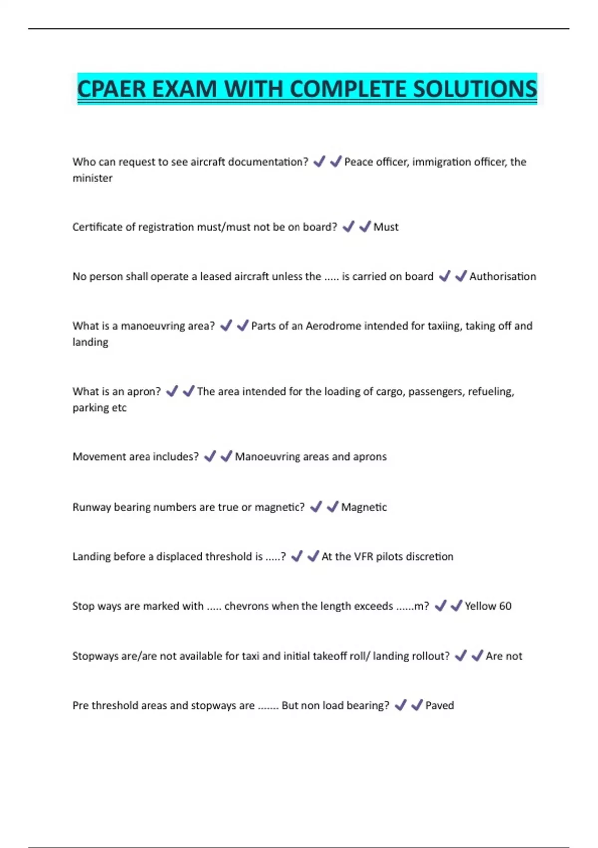 CPAER EXAM WITH COMPLETE SOLUTIONS Who can request to see aircraft documentation? Peace officer, immigration officer, the minister Certificate of registration must/must not be on board? Must No person shall operate a leased aircraft unless the ..... is carried on board Authorisation What is a manoeuvring area? Parts of an Aerodrome intended for taxiing, taking off and landing What is an apron? The area intended for the loading of cargo, passengers, refueling, parking etc Movement area includes? Manoeuvring areas and aprons Runway bearing numbers are true or magnetic? Magnet
