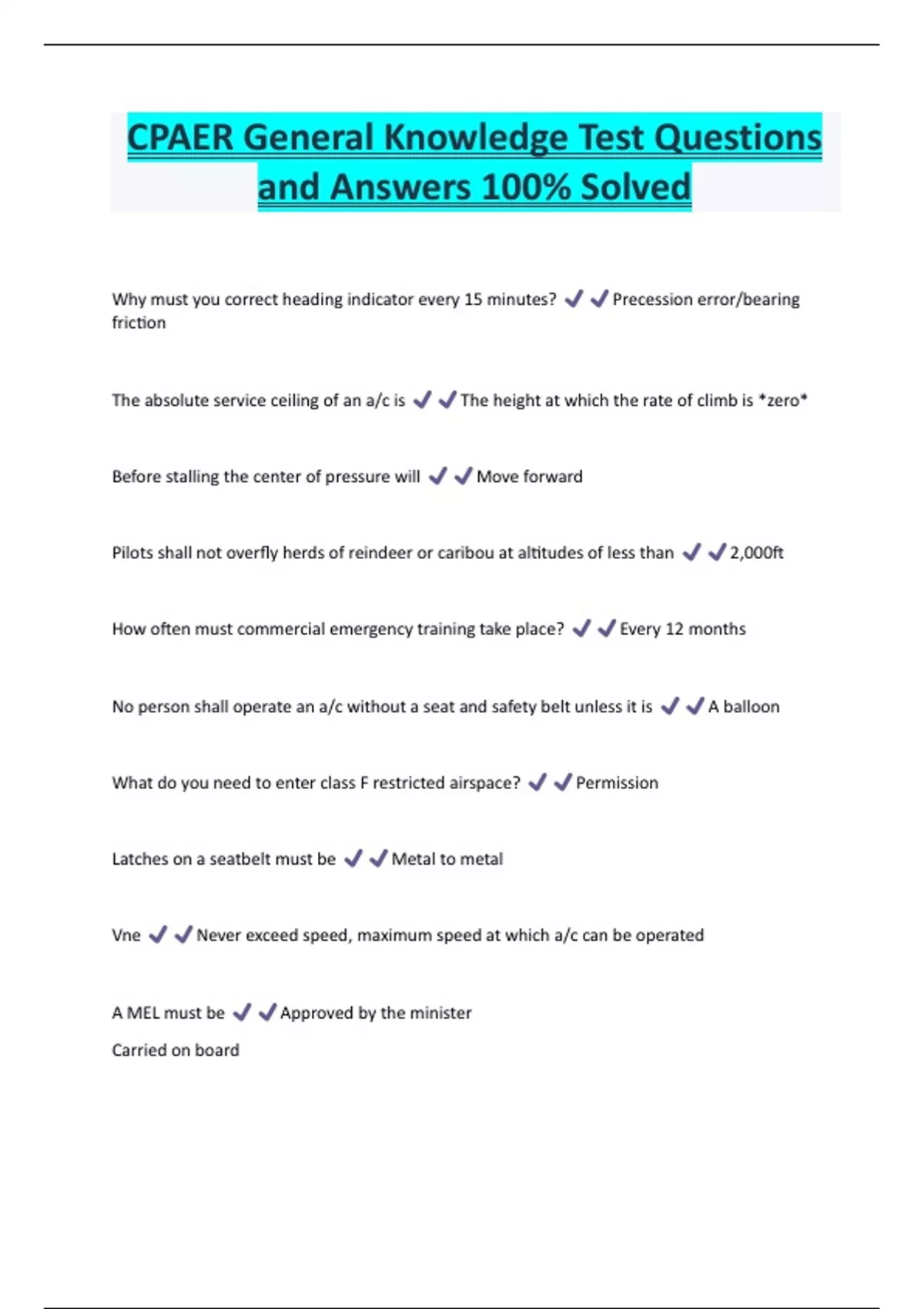 CPAER General Knowledge Test Questions and Answers 100% Solved Why must you correct heading indicator every 15 minutes? Precession error/bearing friction The absolute service ceiling of an a/c is The height at which the rate of climb is *zero* Before stalling the center of pressure will Move forward Pilots shall not overfly herds of reindeer or caribou at altitudes of less than 2,000ft How often must commercial emergency training take place? Every 12 months No person shall operate an a/c without a seat and safety belt unless it is A balloon What do you need to enter class F restricted airspace? Permission Latches on a seatbelt must be Metal to metal