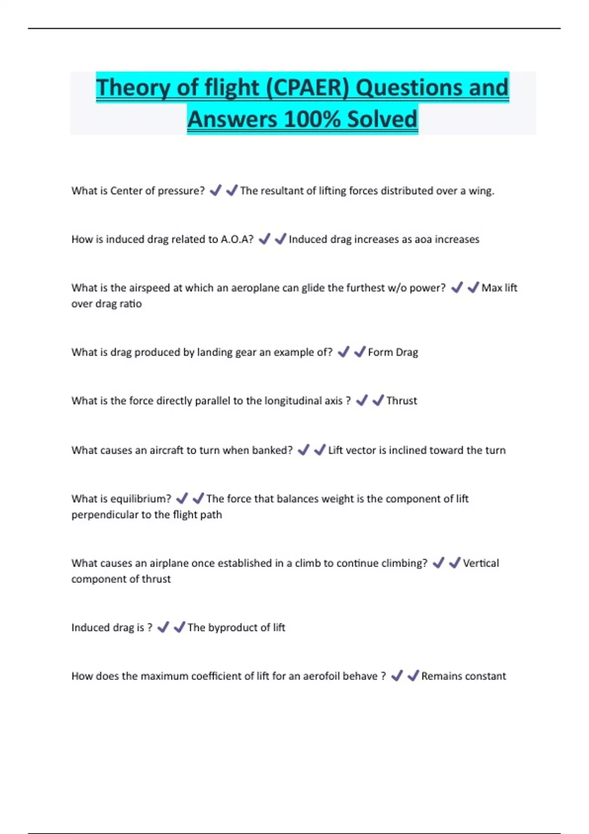 Theory of flight (CPAER) Questions and Answers 100% Solved What is Center of pressure? The resultant of lifting forces distributed over a wing. How is induced drag related to A.O.A? Induced drag increases as aoa increases What is the airspeed at which an aeroplane can glide the furthest w/o power? Max lift over drag ratio What is drag produced by landing gear an example of? Form Drag What is the force directly parallel to the longitudinal axis ? Thrus
