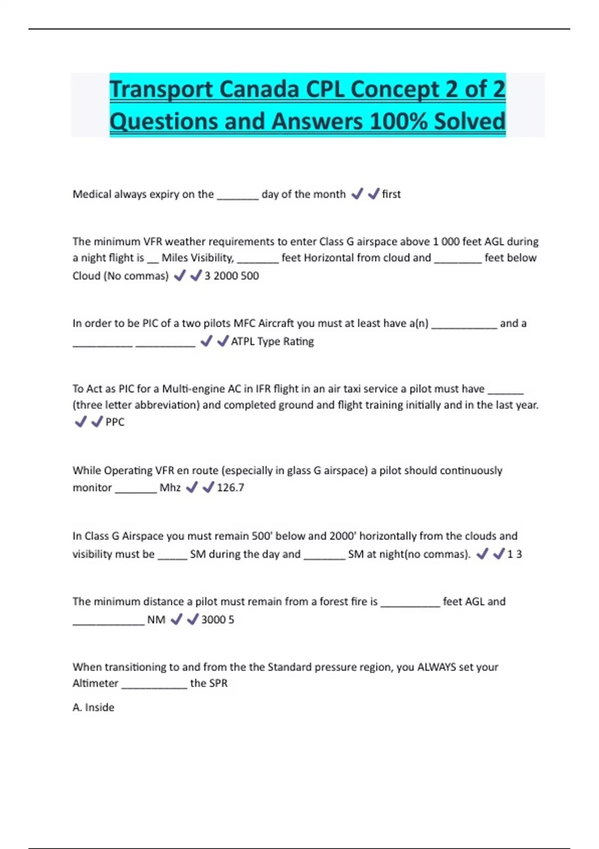Transport Canada CPL Concept 2 of 2 Questions and Answers 100% Solved Medical always expiry on the _______ day of the month first The minimum VFR weather requirements to enter Class G airspace above 1 000 feet AGL during a night flight is __ Miles Visibility, _______ feet Horizontal from cloud and ________ feet below Cloud (No commas) In order to be PIC of a two pilots MFC Aircraft you must at least have a(n) ___________ and a __________ __________ ATPL Type Rating To Act as PIC for a Multi-engine AC in IFR flight in an air taxi service a pilot must have ______ (three letter abbreviation) and completed ground and flight training initially and in the last year. PPC While Operating VFR en route (especially in glass G airspace) a pilot should continuously monitor _______ Mhz 126.7
