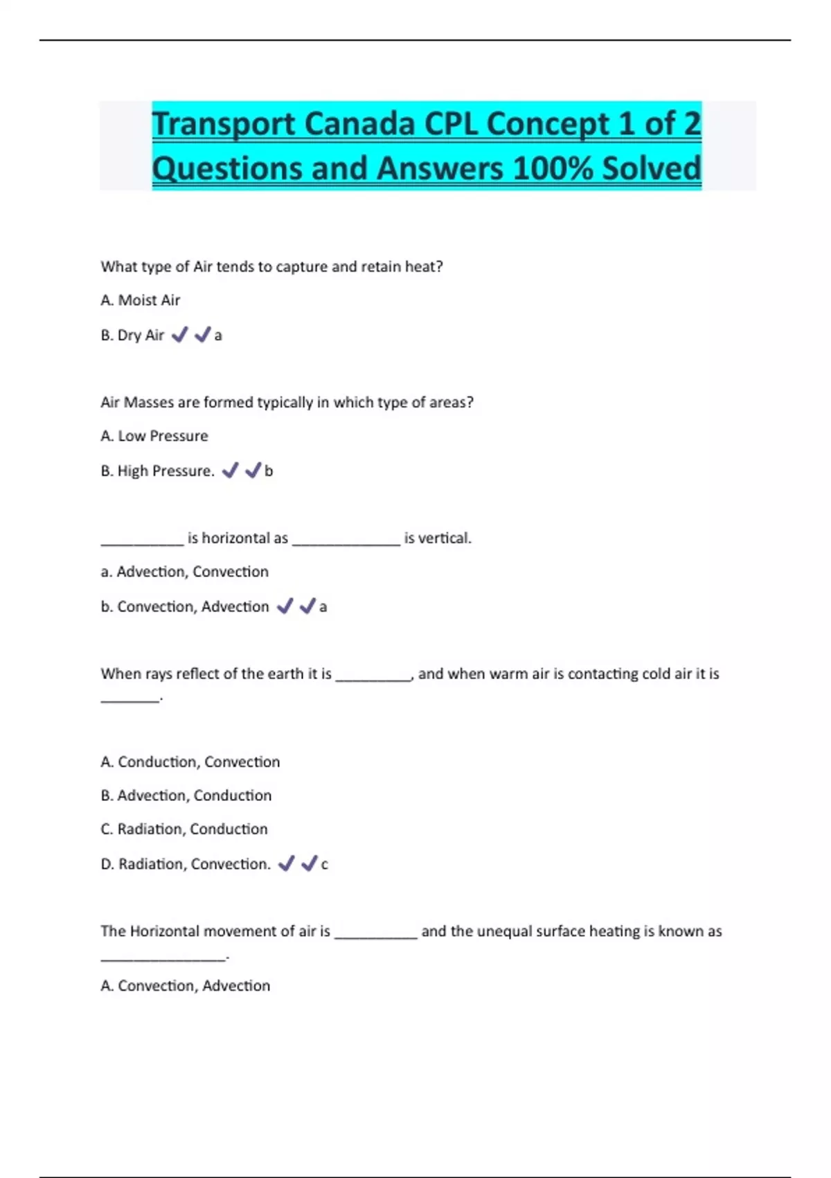 Transport Canada CPL Concept 1 of 2 Questions and Answers 100% Solved What type of Air tends to capture and retain heat? A. Moist Air B. Dry Air a Air Masses are formed typically in which type of areas? A. Low Pressure B. High Pressure. b __________ is horizontal as _____________ is vertical. a. Advection, Convection b. Convection, Advection a When rays reflect of the earth it is _________, and when warm air is contacting cold air it is _______. A. Conduction, Convection B. Advection, Conduction C. Radiation, Conduction D. Radiation, Convection. c