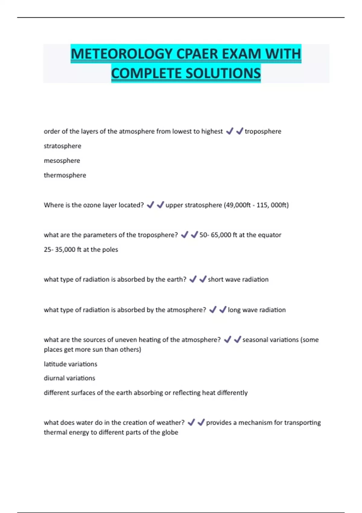 METEOROLOGY CPAER EXAM WITH COMPLETE SOLUTIONS order of the layers of the atmosphere from lowest to highest troposphere stratosphere mesosphere thermosphere Where is the ozone layer located? upper stratosphere (49,000ft - 115, 000ft) what are the parameters of the troposphere? 50- 65,000 ft at the equator 25- 35,000 ft at the poles what type of radiation is absorbed by the earth? short wave radiation what type of radiation is absorbed by the atmosphere? long wave radiation what are the sources of uneven heating of the atmosphere? seasonal variations (some places get more sun than others)