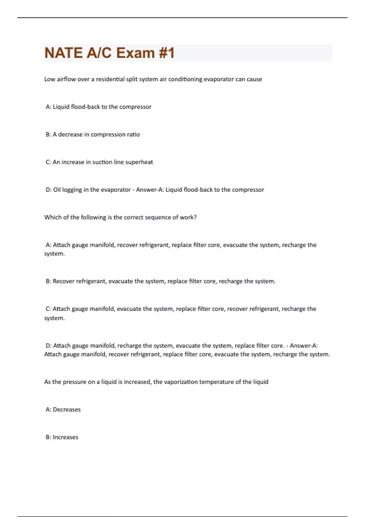 Low airflow over a residential split system air conditioning evaporator can cause A: Liquid flood-back to the compressor B: A decrease in compression ratio C: An increase in suction line superheat D: Oil logging in the evaporator - Answer-A: Liquid flood-back to the compressor Which of the following is the correct sequence of work? A: Attach gauge manifold, recover refrigerant, replace filter core, evacuate the system, recharge the system. B: Recover refrigerant, evacuate the system, replace filter core, recharge the system. C: Attach gauge manifold, evacuate the system, replace filter core, recover refrigerant, recharge the system. D: Attach gauge manifold, recharge the system, evacuate the system, replace filter core. - Answer-A: Attach gauge manifold, recover refrigerant, replace filter core, evacuate the system, recharge the system. As the pressure on a liquid is increased, the vaporization temperature of the liquid A: Decreases B: IncreasesC: Remains unchanged D: Varies - Answer-B: Increases An oil separator must be mounted A: Level B: Below the compressor crankcase C: Above the compressor crankcase D: In the suction line - Answer-A: Level