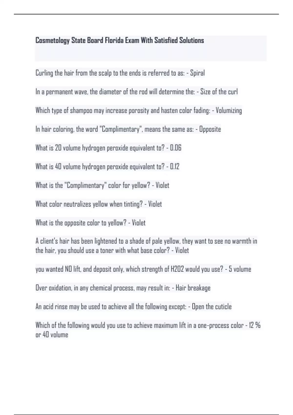 Cosmetology State Board FloridaExam With Satisfied Solutions Curling the hair from the scalp to the ends is referred to as: - Spiral In a permanent wave, the diameter of the rod will determine the: - Size of the curl Which type of shampoo may increase porosity and hasten color fading: -Volumizing In hair coloring, the word "Complimentary", means the same as: - Opposite What is 20 volume hydrogen peroxide equivalent to? - 0.06 What is 40 volume hydrogen peroxide equivalent to? - 0.12 What is the "Complimentary" color for yellow? -Violet What color neutralizes yellow when tinting? -Violet What is the opposite color to yellow? -Violet A client's hair has been lightened to a shade of pale yellow, they want to see no warmth in the hair, you should use a toner with what base color? -Violet you wanted NO lift, and deposit only, which strength of H2O2 would you use? - 5 volume Over oxidation, in any chemical process, may result in: - Hair breakage An acid rinse may be used to achieve all the following except: - Open the cuticle Which of the following would you use to achieve maximum lift in a one-process color - 12 % or 40 volume Approximately how long will a bleach mixture last before losing its potency: - 2 hours What is the "Complimentary" color for Red? - Green What is the "Opposite" color for Red? - Green If a stylist wants to remove tint / artificial color, they should use: - Dye solvent The coloring material of the hair is known as: - Melanin Highlighting shampoo is made by the addition of ammonia water and H2O2 to: - Temporary colors The layer of the hair in which melanin will be found: - Cortex Which type of colors contain pastel shades? - Toners What color could be used to neutralize a green cast in the hair? - Red White hair is discolored with yellow streaks, apply _____ to camouflage the yellow. - A bluing rinse What is the largest organ of the body? - Dermis Sebaceous glands are also known as: - Oil Glands Sudoriferous glands are also known as: - Sweat Glands Irregular shaped patches of skin depigmentation (typically on hands, face, & neck): -Vitiligo The sebaceous glands produce: - Oil The sudoriferous glands produce: - sweat