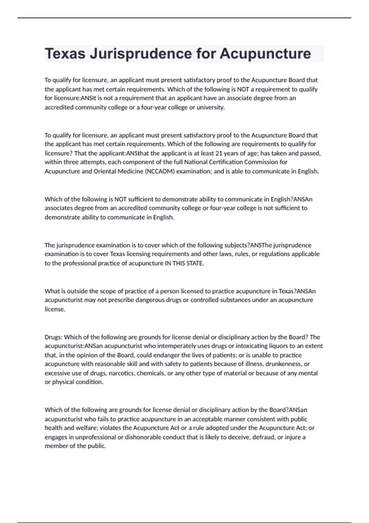 Texas Jurisprudence for Acupuncture Exam Questions And Answers (VERIFIED ANSWERS )