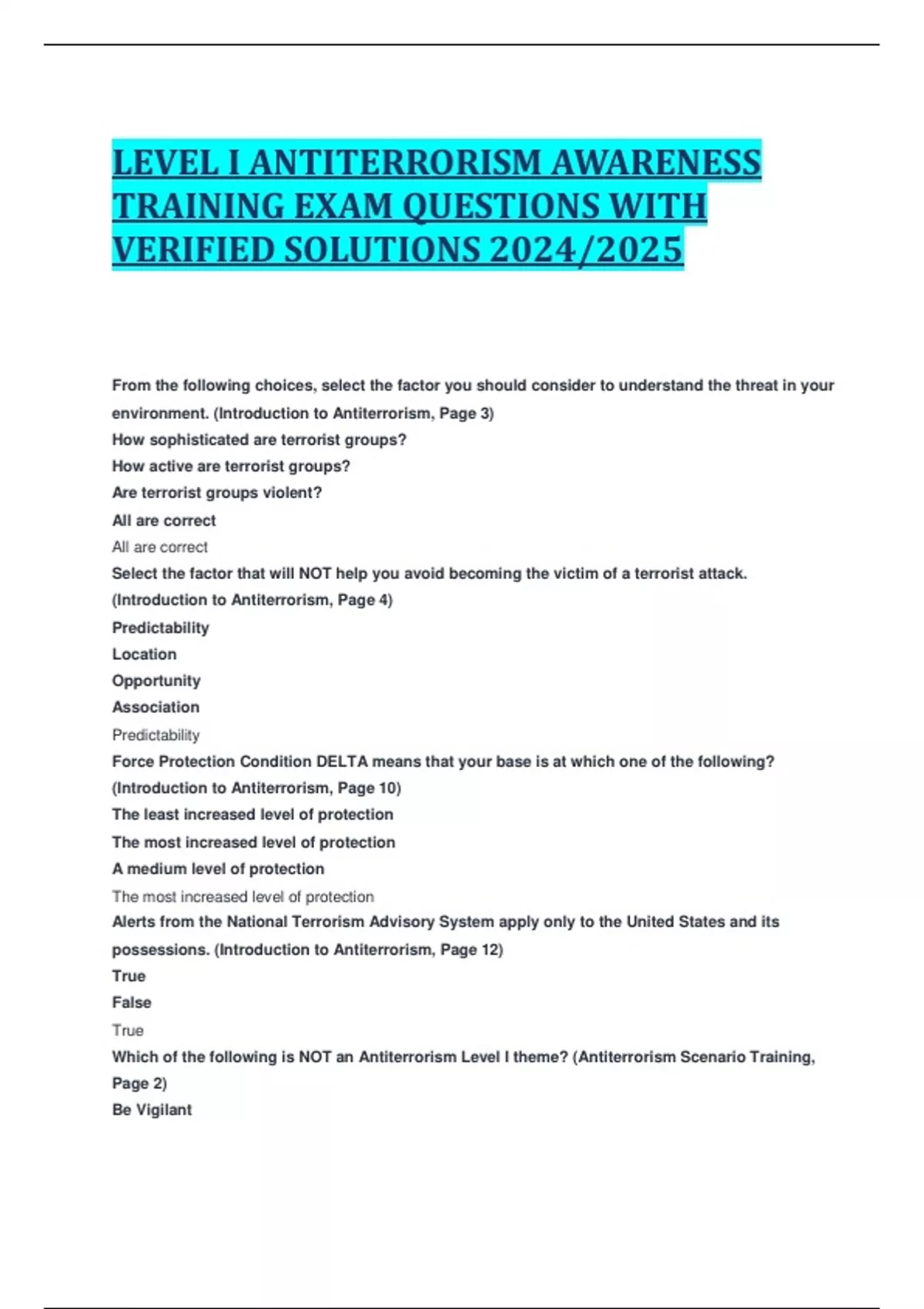 LEVEL I ANTITERRORISM AWARENESS TRAINING EXAM QUESTIONS WITH VERIFIED SOLUTIONS 2024/2025