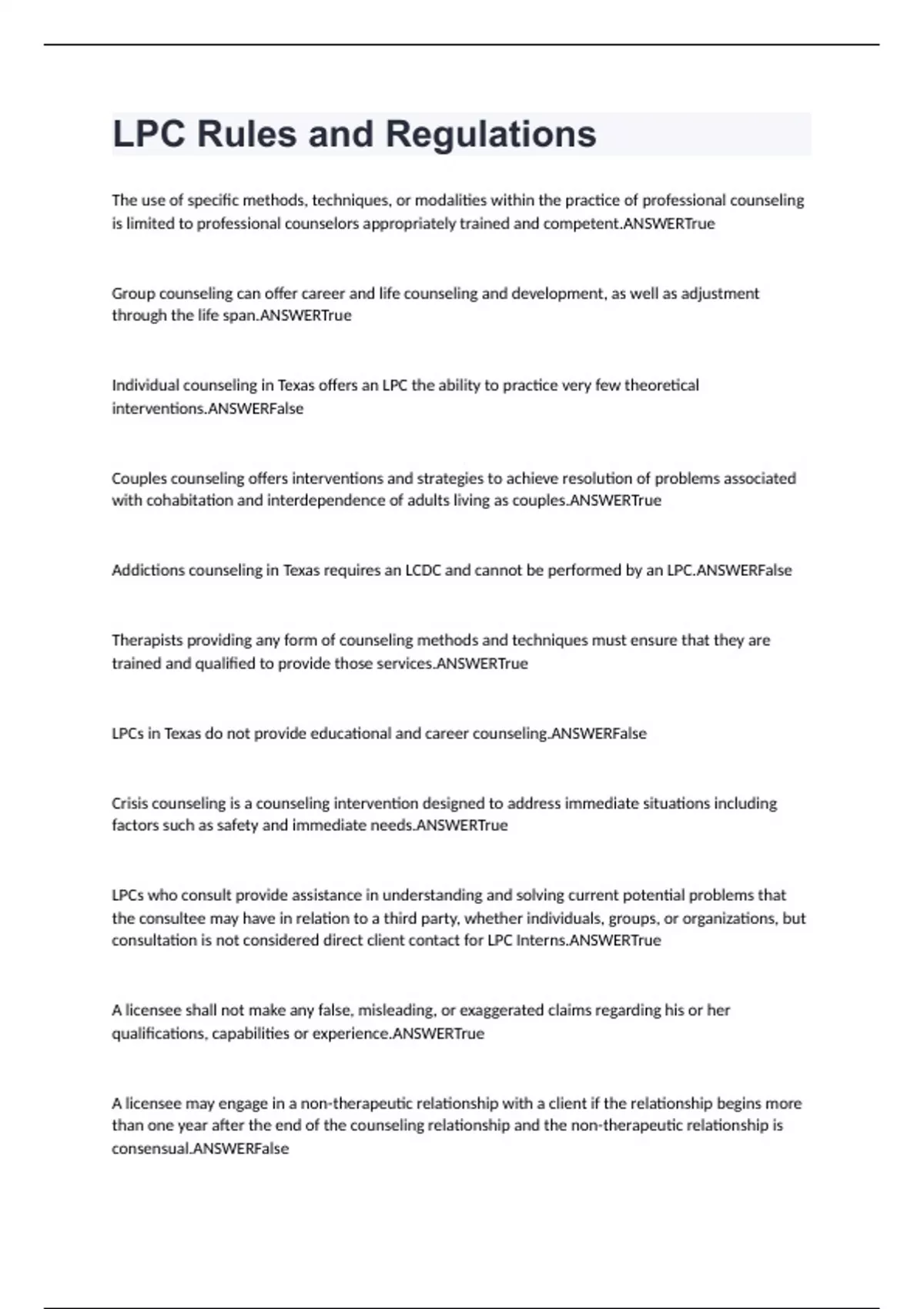 LPC Rules and Regulations Exam Questions And Answers (VERIFIED ANSWERS )