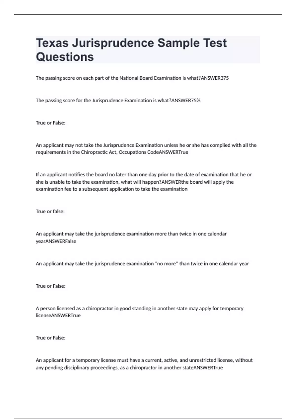 Texas Jurisprudence Sample Test Questions And Answers 2024 (LATEST EDITION )