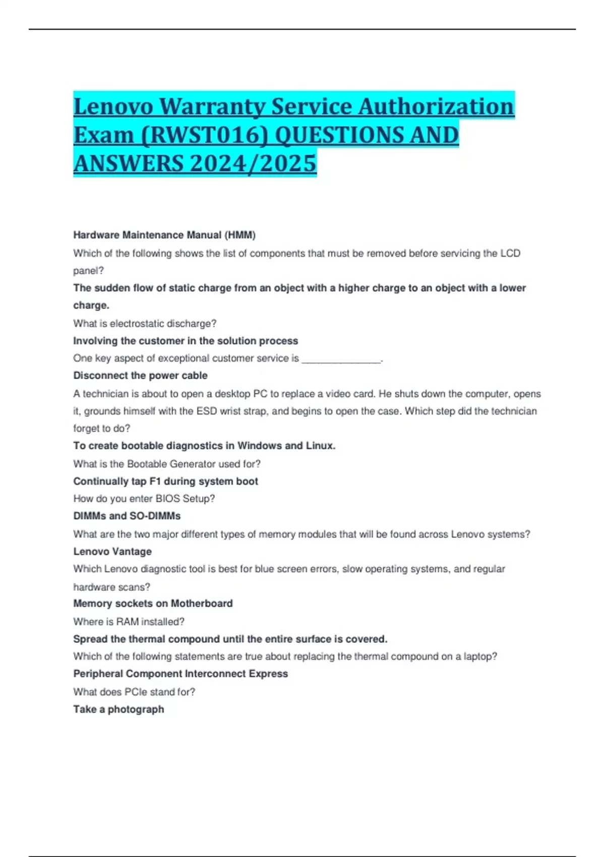 Lenovo Warranty Service Authorization Exam (RWST016) QUESTIONS AND ANSWERS 2024/2025