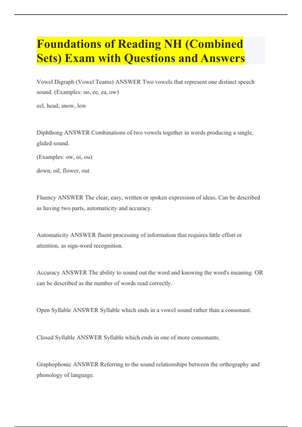 Foundations of Reading NH (Combined Sets) Exam with Questions and Answers Vowel Digraph (Vowel Teams) ANSWER Two vowels that represent one distinct speech sound. (Examples: oo, ee, ea, ow) eel, head, snow, low Diphthong ANSWER Combinations of two vowels together in words producing a single, glided sound. (Examples: ow, oi, ou) down, oil, flower, out Fluency ANSWER The clear, easy, written or spoken expression of ideas. Can be described as having two parts, automaticity and accuracy. Automaticity ANSWER fluent processing of information that requires little effort or attention, as sign-word recognition. Accuracy ANSWER The ability to sound out the word and knowing the word's meaning. OR can be described as the number of words read correctly. Open Syllable ANSWER Syllable which ends in a vowel sound rather than a consonant. Closed Syllable ANSWER Syllable which ends in one of more consonants. Graphophonic ANSWER Referring to the sound relationships between the orthography and phonology of language.