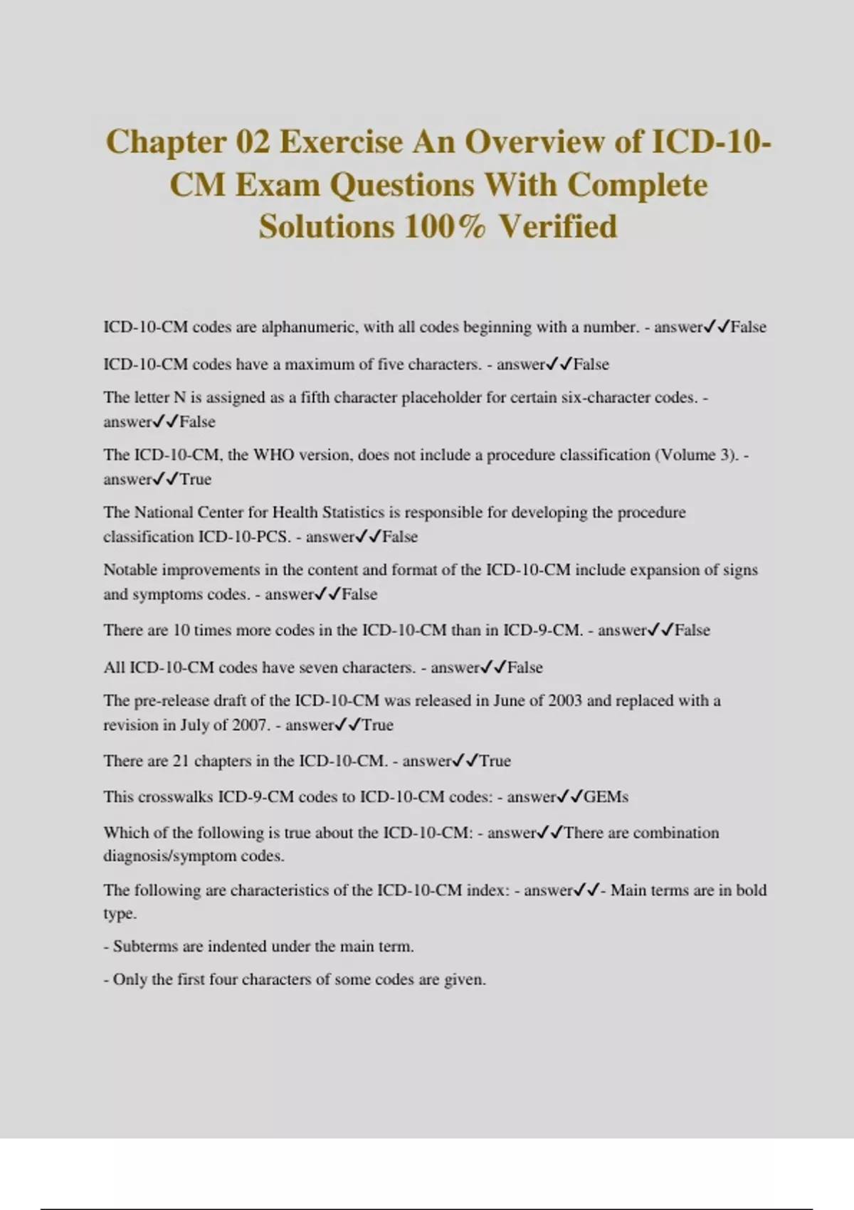 Chapter 02 Exercise An Overview of ICD-10- CM Exam Questions With Complete Solutions 100% Verified ICD-10-CM codes are alphanumeric, with all codes beginning with a number. - answerFalse ICD-10-CM codes have a maximum of five characters. - answerFalse The letter N is assigned as a fifth character placeholder for certain six-character codes. - answerFalse The ICD-10-CM, the WHO version, does not include a procedure classification (Volume 3). - answerTrue The National Center for Health Statistics is responsible for developing the procedure classification ICD-10-PCS. - answerFalse Notable improvements in the content and format of the ICD-10-CM include expansion of signs and symptoms codes. - answerFalse There are 10 times more codes in the ICD-10-CM than in ICD-9-CM. - answerFalse All ICD-10-CM codes have seven characters. - answerFalse The pre-release draft of the ICD-10-CM was released in June of 2003 and replaced with a revision in July of 2007. - answerTrue There are 21 chapters in the ICD-10-CM. - answerTrue This crosswalks ICD-9-CM codes to ICD-10-CM codes: - answerGEMs Which of the following is true about the ICD-10-CM: - answerThere are combination diagnosis/symptom codes. The following are characteristics of the ICD-10-CM index: - answer- Main terms are in bold type. - Subterms are indented under the main term. - Only the first four characters of some codes are given.