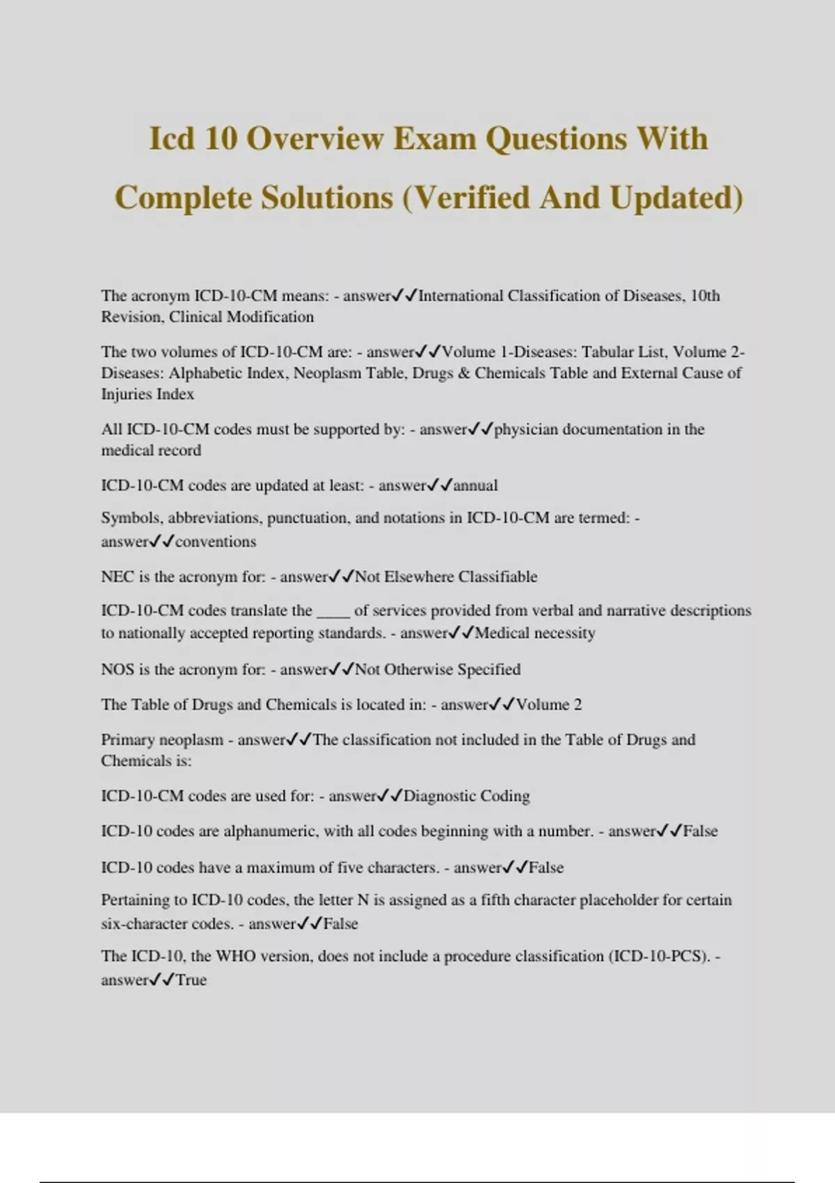 Icd 10 Overview Exam Questions With Complete Solutions (Verified And Updated) The acronym ICD-10-CM means: - answerInternational Classification of Diseases, 10th Revision, Clinical Modification The two volumes of ICD-10-CM are: - answerVolume 1-Diseases: Tabular List, Volume 2- Diseases: Alphabetic Index, Neoplasm Table, Drugs & Chemicals Table and External Cause of Injuries Index All ICD-10-CM codes must be supported by: - answerphysician documentation in the medical record ICD-10-CM codes are updated at least: - answerannual Symbols, abbreviations, punctuation, and notations in ICD-10-CM are termed: - answerconventions NEC is the acronym for: - answerNot Elsewhere Classifiable ICD-10-CM codes translate the ____ of services provided from verbal and narrative descriptions to nationally accepted reporting standards. - answerMedical necessity NOS is the acronym for: - answerNot Otherwise Specified