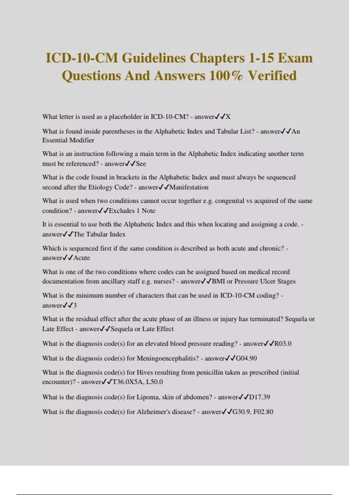ICD-10-CM Guidelines Chapters 1-15 Exam Questions And Answers 100% Verified What letter is used as a placeholder in ICD-10-CM? - answerX What is found inside parentheses in the Alphabetic Index and Tabular List? - answerAn Essential Modifier What is an instruction following a main term in the Alphabetic Index indicating another term must be referenced? - answerSee What is the code found in brackets in the Alphabetic Index and must always be sequenced second after the Etiology Code? - answerManifestation What is used when two conditions cannot occur together e.g. congenital vs acquired of the same condition? - answerExcludes 1 Note It is essential to use both the Alphabetic Index and this when locating and assigning a code. - answerThe Tabular Index Which is sequenced first if the same condition is described as both acute and chronic? - answerAcute What is one of the two conditions where codes can be assigned based on medical record documentation from ancillary staff e.g. nurses? - answerBMI or Pressure Ulcer Stages What is the minimum number of characters that can be used in ICD-10-CM coding? - answer3 What is the residual effect after the acute phase of an illness or injury has terminated? Sequela or Late Effect - answerSequela or Late Effect What is the diagnosis code(s) for an elevated blood pressure reading? - answerR03.0 What is the diagnosis code(s) for Meningoencephalitis? - answerG04.90 What is the diagnosis code(s) for Hives resulting from penicillin taken as prescribed (initial encounter)? - answerT36.0X5A, L50.0 What is the diagnosis code(s) for Lipoma, skin of abdomen? - answerD17.39 What is the diagnosis code(s) for Alzheimer's disease? - answerG30.9, F02.80 What is the diagnosis code(s) assigned for Proteinuria complicating pregnancy? - answerO12.10, Z3A.00 What is found in the first black section of the ICD-10-CM book? - answerThe Neoplasm Table What is found in the 2nd light blue section of the ICD-10-CM book? - answerSymptoms, Signs, and Abnormal Clinical and Laboratory Findings What page can The Table of Drugs and Chemicals be found on? - answerPage 339 What category of codes can you find the newborn codes in? - answerP00-P96 What page are the chapter specific guidelines for adverse effects, poisoning, under-dosing and toxic effects found on? - answerPage 20 of the Coding Guidelines What color is used to show what documentation differentiates the codes? - answerGreen What color is a 7th character extension alert shown in? - answerAqua What color is an unspecified code highlighted in? - answerYellow What color is a manifestation code highlighted in? - answerBlue What color in the Tabular List is the Code also and Use additional code shown in? - answerRed [ ] Brackets in Tabular list - answerSynonyms, alternative wording, explanations. Disease manifestations. Mandatory dual coding, e.g.G30.9 [F02.80] in Index = Code both ( ) Parentheses - answerSupplementary words AKA Nonessential modifiers Use of "and" - answerMeans "and/or" Excludes notes (1 and 2) - answerExcludes 1 = Not coded here. The excluded code should never be used at the same time as the code above the Excludes 1 note. Excludes 2 = Not included here. Code if patient has it along with main code "In diseases classified elsewhere" - answerManifestation codes. May not be primary diagnosis. Underlying disease is primary diagnosis. Codes in brackets on secondary diagnosis. "See" - answerGo to the code directed and use it "See Also" - answerThere is another term that may be useful. No need to follow if original term describes the condition "Code Also" - answerHelps fully describe the condition, but no sequencing direction. You decide what the primary diagnosis is