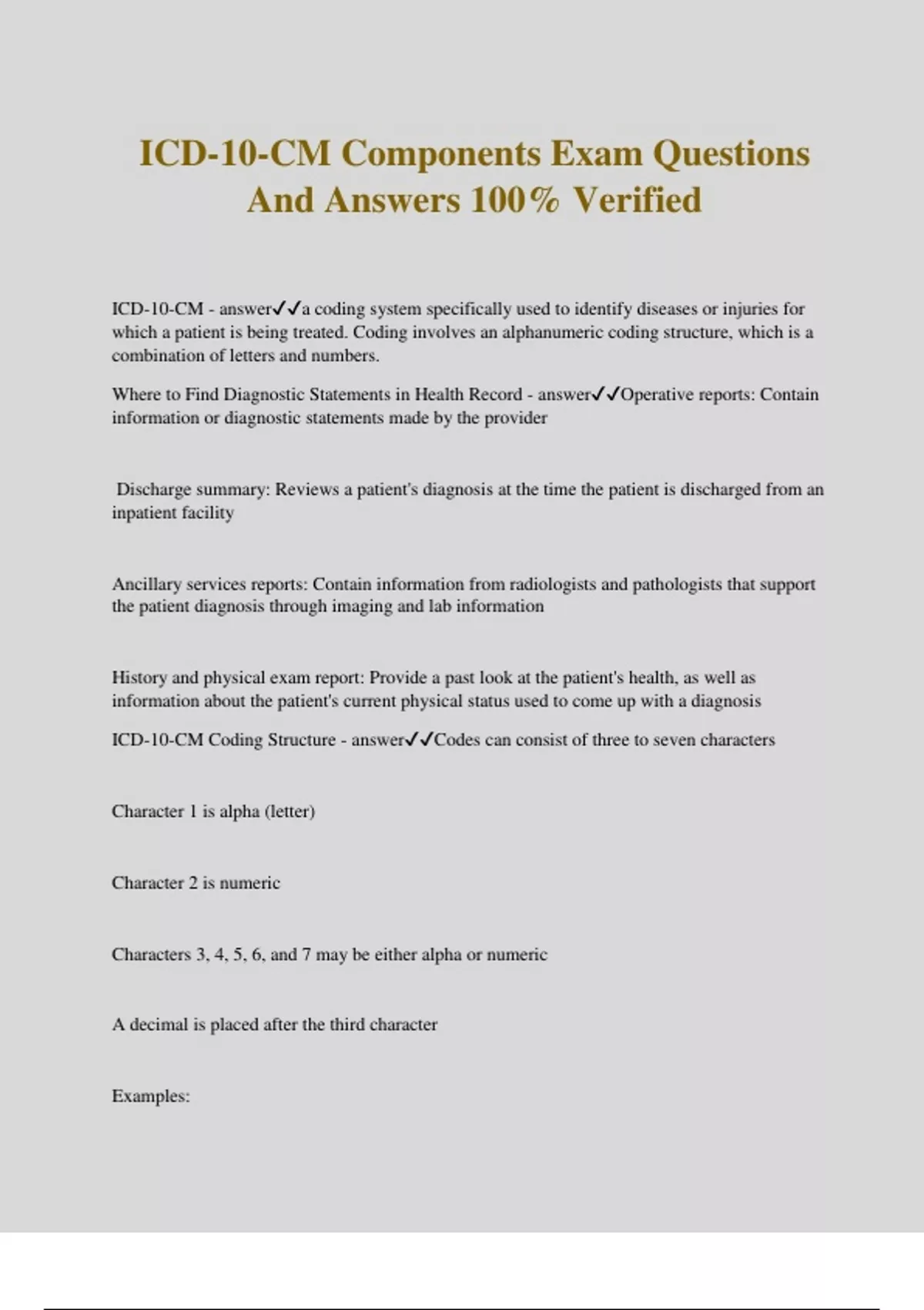 ICD-10-CM Components Exam Questions And Answers 100% Verified ICD-10-CM - answera coding system specifically used to identify diseases or injuries for which a patient is being treated. Coding involves an alphanumeric coding structure, which is a combination of letters and numbers. Where to Find Diagnostic Statements in Health Record - answerOperative reports: Contain information or diagnostic statements made by the provider Discharge summary: Reviews a patient's diagnosis at the time the patient is discharged from an inpatient facility Ancillary services reports: Contain information from radiologists and pathologists that support the patient diagnosis through imaging and lab information History and physical exam report: Provide a past look at the patient's health, as well as information about the patient's current physical status used to come up with a diagnosis ICD-10-CM Coding Structure - answerCodes can consist of three to seven characters Character 1 is alpha (letter) Character 2 is numeric Characters 3, 4, 5, 6, and 7 may be either alpha or numeric A decimal is placed after the third character Examples: A18.01 (code for tuberculosis of the spine) O9A.319 (code for physical abuse complicating pregnancy, unspecified semester) S90.922A (code for unspecified superficial injury of left foot, initial encounter) ICD-10-CM Characters 1, 2, 3 - answerThe first three characters represent the code category, such as the category in which the disease or injury belongs. An example of a category is Certain Infectious and Parasitic Diseases. ICD-10-CM Characters 4, 5, 6 - answerCharacters 4, 5, and 6 represent the etiology, anatomic site, and severity. ICD-10-CM Character 7 - answerIf a code has seven characters, the seventh character is also called the "extension code." It is used mainly to define specific details of injury, poisoning, consequences of external causes and pregnancy, childbirth, and puerperium (postpartum). Main Terms (ICD-10-CM) - answerRepresent the essence of the disease definition without any details Appear in bold Nonessential Modifiers (ICD-10-CM) - answerServe as supplementary words or explanatory information Are placed in parentheses Do not affect the code assignment Essential Modifiers (ICD-10-CM) - answerTerms that change the description of the diagnosis (in bold) Indented one space to the right Located under the main term