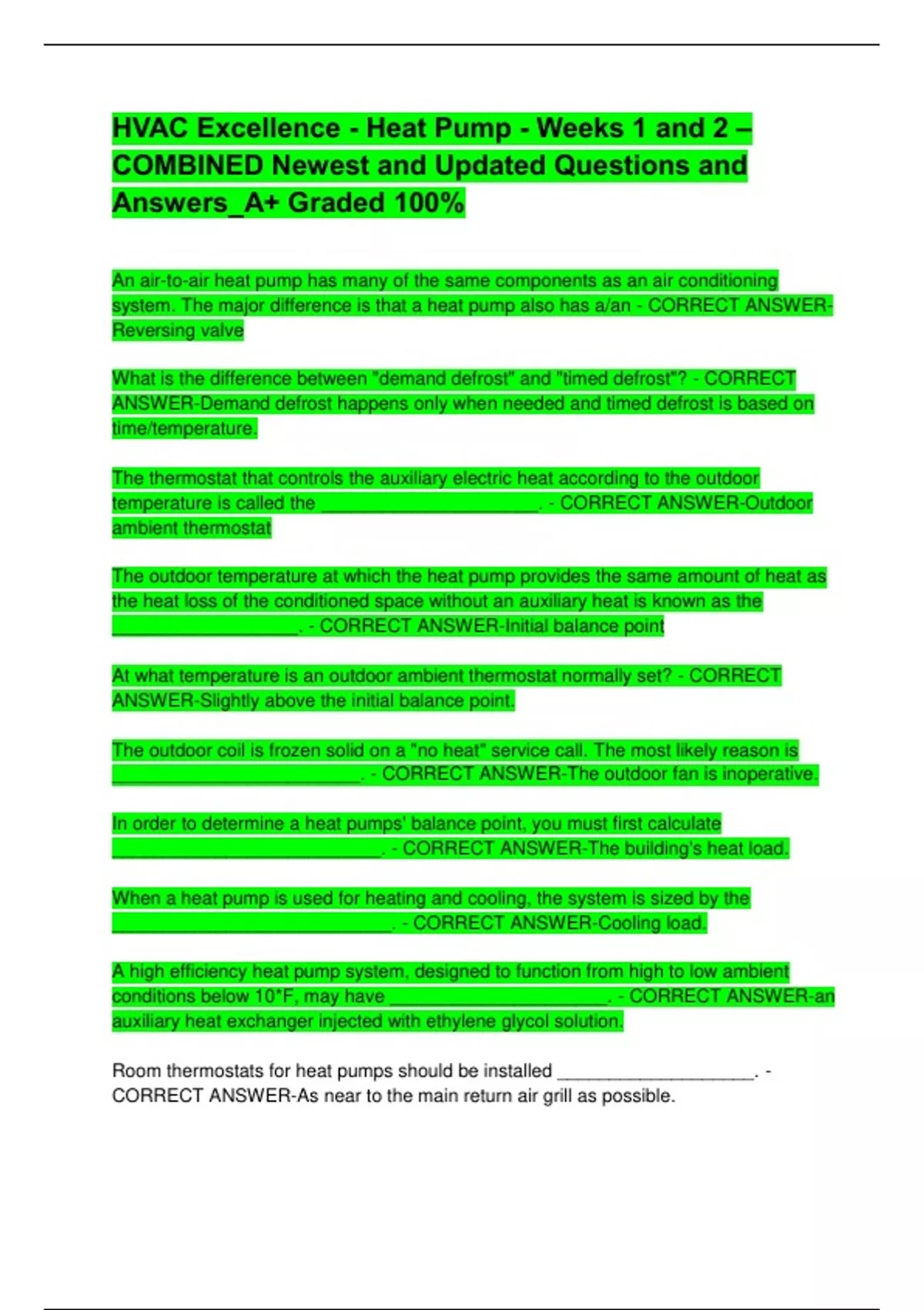 HVAC Excellence - Heat Pump - Weeks 1 and 2 – COMBINED Newest and Updated Questions and Answers_A+ Graded 100% An air-to-air heat pump has many of the same components as an air conditioning system. The major difference is that a heat pump also has a/an - CORRECT ANSWER-Reversing valve What is the difference between "demand defrost" and "timed defrost"? - CORRECT ANSWER-Demand defrost happens only when needed and timed defrost is based on time/temperature. The thermostat that controls the auxiliary electric heat according to the outdoor temperature is called the _____________________. - CORRECT ANSWER-Outdoor ambient thermostat The outdoor temperature at which the heat pump provides the same amount of heat as the heat loss of the conditioned space without an auxiliary heat is known as the __________________. - CORRECT ANSWER-Initial balance point At what temperature is an outdoor ambient thermostat normally set? - CORRECT ANSWER-Slightly above the initial balance point. The outdoor coil is frozen solid on a "no heat" service call. The most likely reason is ________________________. - CORRECT ANSWER-The outdoor fan is inoperative. In order to determine a heat pumps' balance point, you must first calculate __________________________. - CORRECT ANSWER-The building's heat load. When a heat pump is used for heating and cooling, the system is sized by the ___________________________. - CORRECT ANSWER-Cooling load. A high efficiency heat pump system, designed to function from high to low ambient conditions below 10*F, may have _____________________. - CORRECT ANSWER-an auxiliary heat exchanger injected with ethylene glycol solution. Room thermostats for heat pumps should be installed ___________________. - CORRECT ANSWER-As near to the main return air grill as possible.