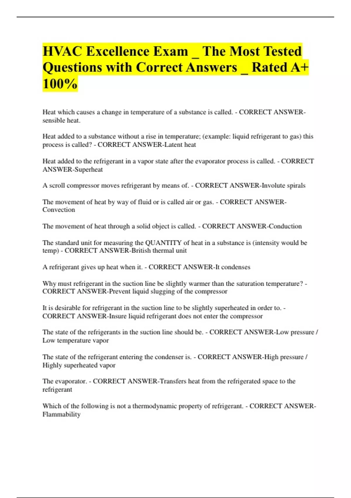 HVAC Excellence Exam _ The Most Tested Questions with Correct Answers _ Rated A+ 100% Heat which causes a change in temperature of a substance is called. - CORRECT ANSWER-sensible heat. Heat added to a substance without a rise in temperature; (example: liquid refrigerant to gas) this process is called? - CORRECT ANSWER-Latent heat Heat added to the refrigerant in a vapor state after the evaporator process is called. - CORRECT ANSWER-Superheat A scroll compressor moves refrigerant by means of. - CORRECT ANSWER-Involute spirals The movement of heat by way of fluid or is called air or gas. - CORRECT ANSWER-Convection The movement of heat through a solid object is called. - CORRECT ANSWER-Conduction The standard unit for measuring the QUANTITY of heat in a substance is (intensity would be temp) - CORRECT ANSWER-British thermal unit A refrigerant gives up heat when it. - CORRECT ANSWER-It condenses Why must refrigerant in the suction line be slightly warmer than the saturation temperature? - CORRECT ANSWER-Prevent liquid slugging of the compressor It is desirable for refrigerant in the suction line to be slightly superheated in order to. - CORRECT ANSWER-Insure liquid refrigerant does not enter the compressor The state of the refrigerants in the suction line should be. - CORRECT ANSWER-Low pressure / Low temperature vapor The state of the refrigerant entering the condenser is. - CORRECT ANSWER-High pressure / Highly superheated vapor The evaporator. - CORRECT ANSWER-Transfers heat from the refrigerated space to the refrigerant Which of the following is not a thermodynamic property of refrigerant. - CORRECT ANSWER-Flammability