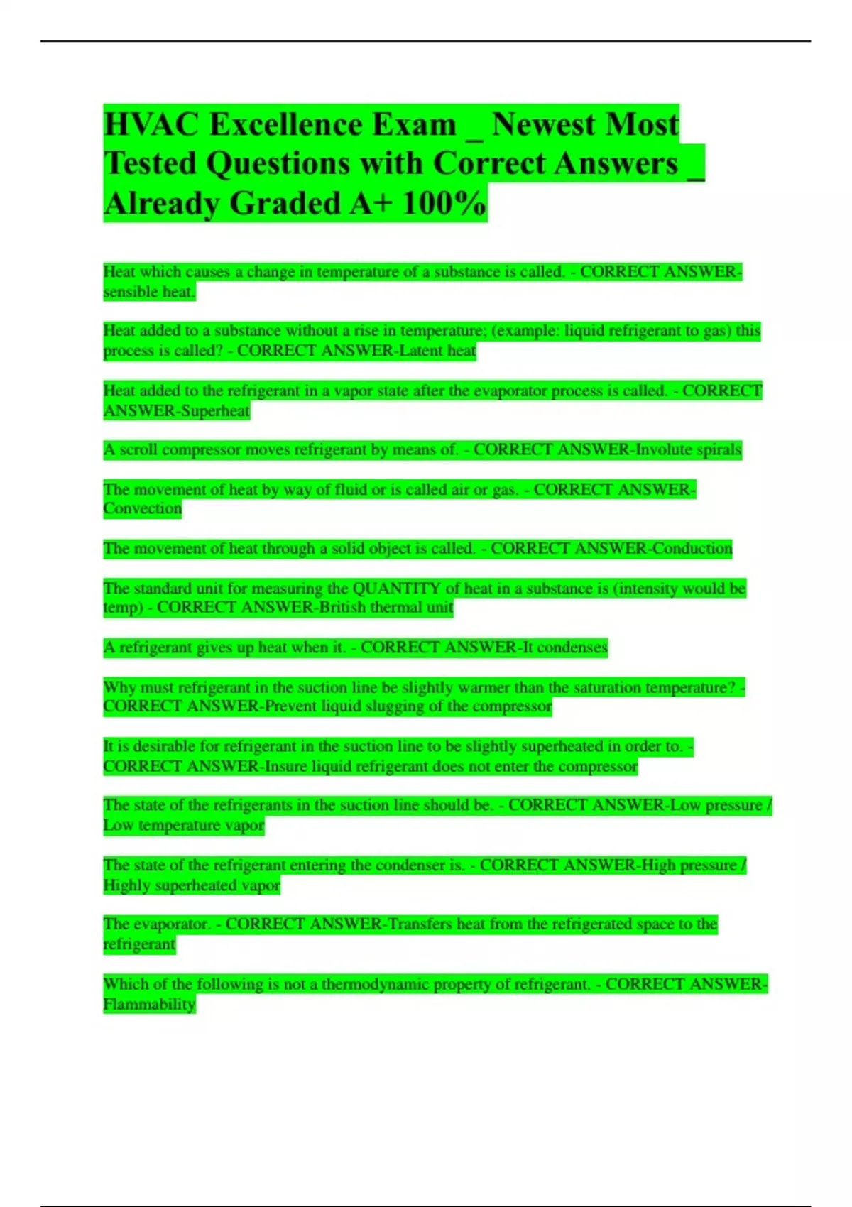 HVAC Excellence Exam _ Newest Most Tested Questions with Correct Answers _ Already Graded A+ 100% Heat which causes a change in temperature of a substance is called. - CORRECT ANSWER-sensible heat. Heat added to a substance without a rise in temperature; (example: liquid refrigerant to gas) this process is called? - CORRECT ANSWER-Latent heat Heat added to the refrigerant in a vapor state after the evaporator process is called. - CORRECT ANSWER-Superheat A scroll compressor moves refrigerant by means of. - CORRECT ANSWER-Involute spirals The movement of heat by way of fluid or is called air or gas. - CORRECT ANSWER-Convection The movement of heat through a solid object is called. - CORRECT ANSWER-Conduction The standard unit for measuring the QUANTITY of heat in a substance is (intensity would be temp) - CORRECT ANSWER-British thermal unit A refrigerant gives up heat when it. - CORRECT ANSWER-It condenses Why must refrigerant in the suction line be slightly warmer than the saturation temperature? - CORRECT ANSWER-Prevent liquid slugging of the compressor It is desirable for refrigerant in the suction line to be slightly superheated in order to. - CORRECT ANSWER-Insure liquid refrigerant does not enter the compressor The state of the refrigerants in the suction line should be. - CORRECT ANSWER-Low pressure / Low temperature vapor The state of the refrigerant entering the condenser is. - CORRECT ANSWER-High pressure / Highly superheated vapor The evaporator. - CORRECT ANSWER-Transfers heat from the refrigerated space to the refrigerant Which of the following is not a thermodynamic property of refrigerant. - CORRECT ANSWER-Flammability The sequential order of stepson the vapor-compression process are. - CORRECT ANSWER-Compression, condensation, expansion, vaporization