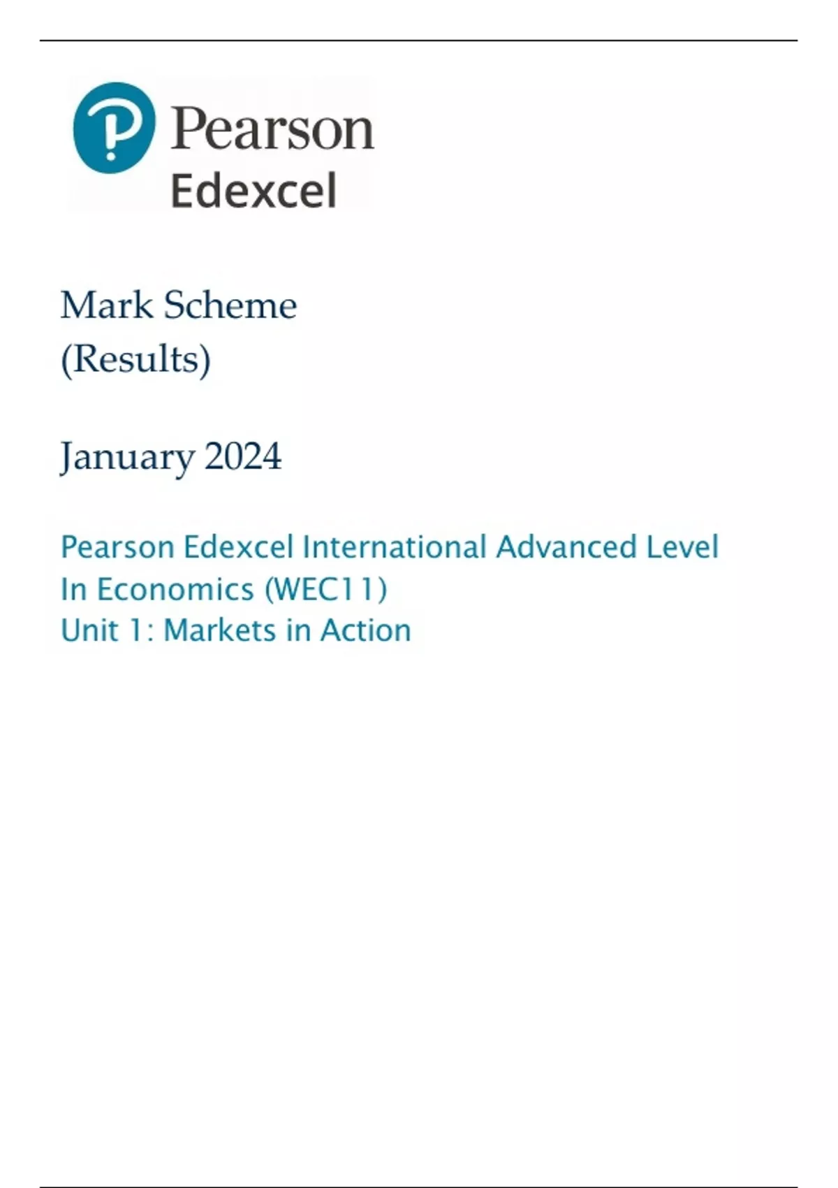 Mark Scheme (Results) January 2024 Pearson Edexcel International Advanced Level In Economics (WEC11) Unit 1: Markets in Action Edexcel and BTEC Qualifications Edexcel and BTEC qualifications are awarded by Pearson, the UK’s largest awarding body. We provide a wide range of qualifications including academic, vocational, occupational and specific programmes for employers. For further information visit our qualifications websites at www.e dexcel.com or www.btec.co.uk . Alternatively, you can get in touch with us using the details on our contact us page at www.edexcel.com/contactus . Pearson: helping people progress, everywhere Pearson aspires to be the world’s leading learning company. Our aim is to help everyone progress in their lives through education. We believe in every kind of learning, for all kinds of people, wherever they are in the world. We’ve been involved in education for over 150 years, and by working across 70 countries, in 100 languages, we have built an international reputation for our commitment to high standards and raising achievement through innovation in education. Find out more about how we can help you and your students at: www.pearson.com/uk January 2024 Question Paper Log Number P73482A Publications Code WEC11_01_MS_2401 All the material in this publication is copyright © Pearson Education Ltd 2024 General Marking Guidance • All candidates must receive the same treatment. Examiners must mark the first candidate in exactly the same way as they mark the last. • Mark schemes should be applied positively. Candidates must be rewarded for what they have shown they can do rather than penalised for omissions. • Examiners should mark according to the mark scheme not according to their perception of where the grade boundaries may lie. • There is no ceiling on achievement. All marks on the mark scheme should be used appropriately. • All the marks on the mark scheme are designed to be awarded. Examiners should always award full marks if deserved, i.e. if the answer matches the mark scheme. Examiners should also be prepared to award zero marks if the candidate’s response is not worthy of credit according to the mark scheme. • Where some judgement is required, mark schemes will provide the principles by which marks will be awarded and exemplific ation may be limited. • When examiners are in doubt regarding the application of the mark scheme to a candidate’s response, the team leader must be consulted. • Crossed out work should be marked UNLESS the candidate has replaced it with an alternative response.