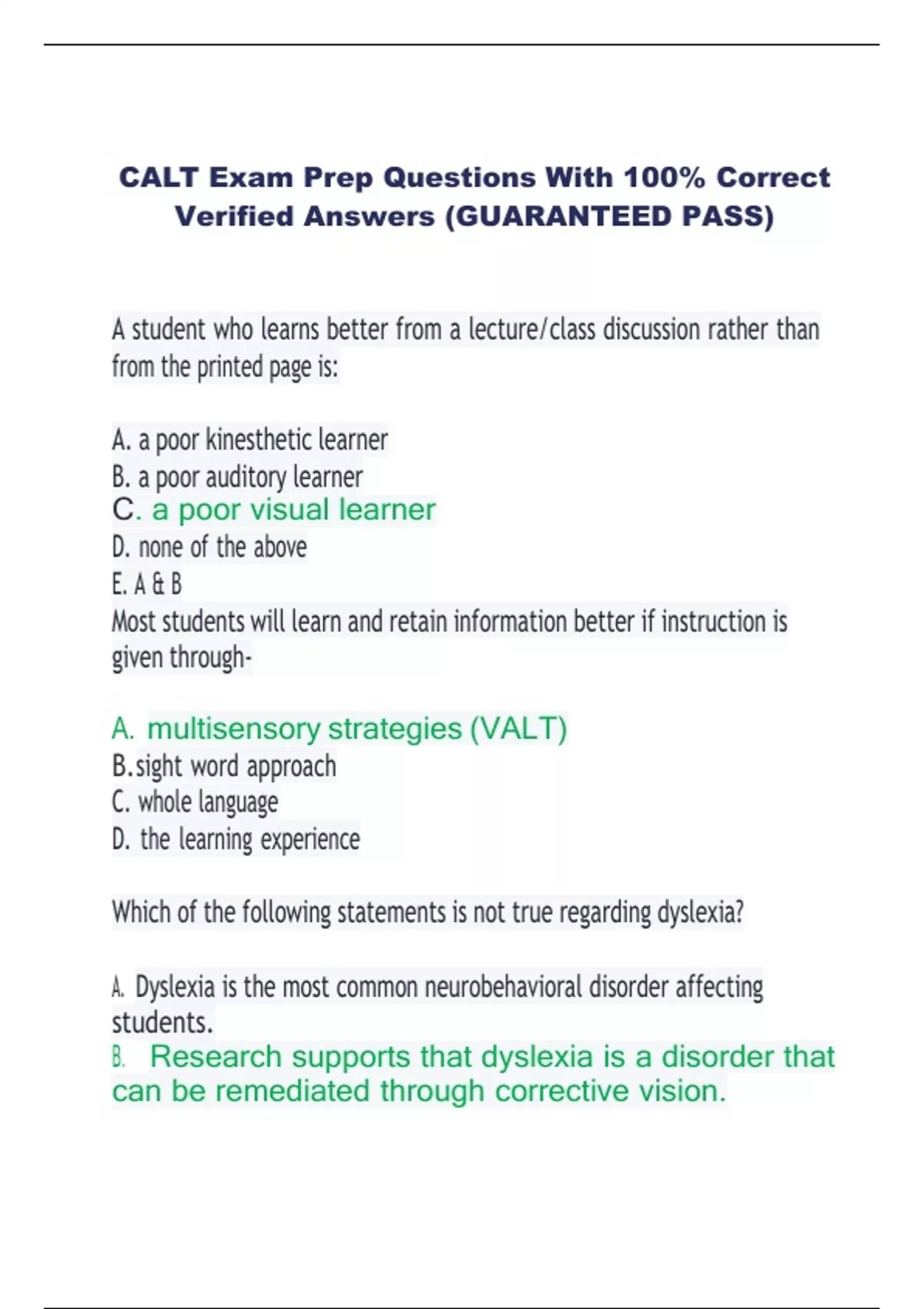 CALT Exam Prep Questions With 100% Correct Verified Answers (GUARANTEED PASS) A student who learns better from a lecture/class discussion rather than from the printed page is: A. a poor kinesthetic learner B. a poor auditory learner C. a poor visual learner D. none of the above E. A & B Most students will learn and retain information better if instruction is given throughA. multisensory strategies (VALT) B.sight word approach C. whole language D. the learning experience Which of the following statements is not true regarding dyslexia? A. Dyslexia is the most common neurobehavioral disorder affecting students. B. Research supports that dyslexia is a disorder that can be remediated through corrective vision. C. Dyslexics appear to have anatomical differences. D. Research shows that the brain of the dyslexic develops and functions differently from other brains. A student is making A's and B's in the classroom but is a slow reader. The teacher would like to assess her because of the reading difficulties. What type of assessment should she give her? A. formal B. informal C. standard Which item is true about linguistics - based beginning reading approach? A. Reliance of trade books and magazines for reading material. B. Emphasis on prediction and guessing from context. C. Learning to recognize word families (bat, cat, hat) D. Emphasis on decoding and blending sounds into words. To teach syllable division, Mr. Smart first taught his students to recognize closed or (VC) syllables. He then showed the class words such as napkin, impact, and mascot and discussed accent. Later, he demonstrated how the words could be divided into two syllables. Finally he gave the students syllables and asked them to construct words. This is an example of: A. discovery learning B. synthetic and analytic instruction C. synthetic instruction D. analytic instruction Controlled reading and spelling vocabulary are characteristics of: A. decodable text B. linguistic programs C. an MSL program D. all of the above Repeating prior information in a multisensory structured language program is essential to ensure which of the following? A. visual recognition B. auditory recall C. automaticity D. kinesthetic memory