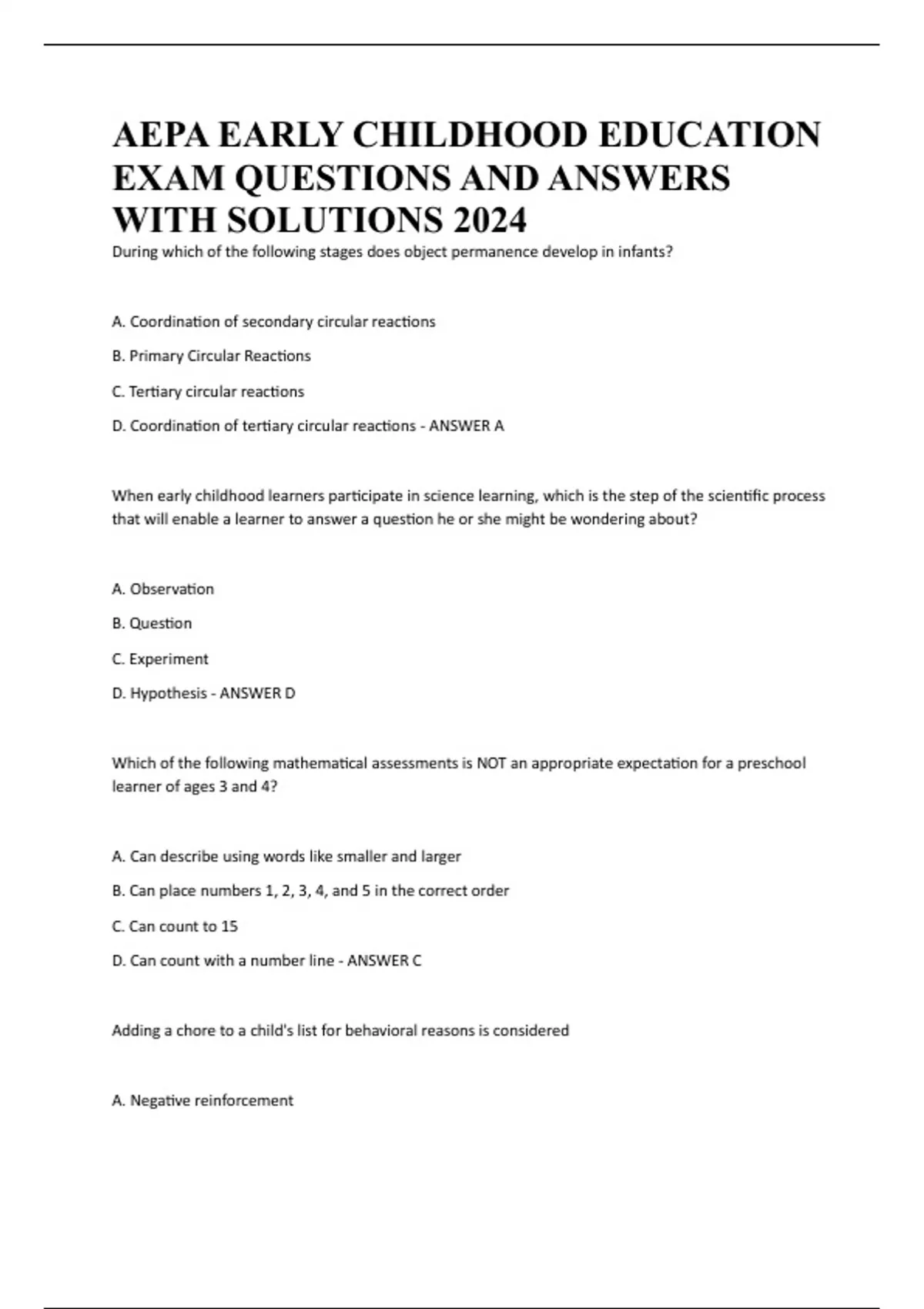 AEPA EARLY CHILDHOOD EDUCATION EXAM QUESTIONS AND ANSWERS WITH SOLUTIONS 2024