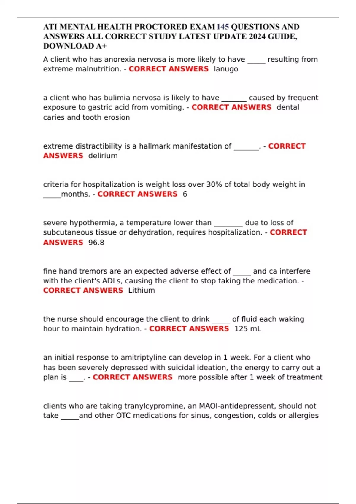 ATI MENTAL HEALTH PROCTORED EXAM 145 QUESTIONS AND ANSWERS ALL CORRECT STUDY LATEST UPDATE 2024 GUIDE, DOWNLOAD A+