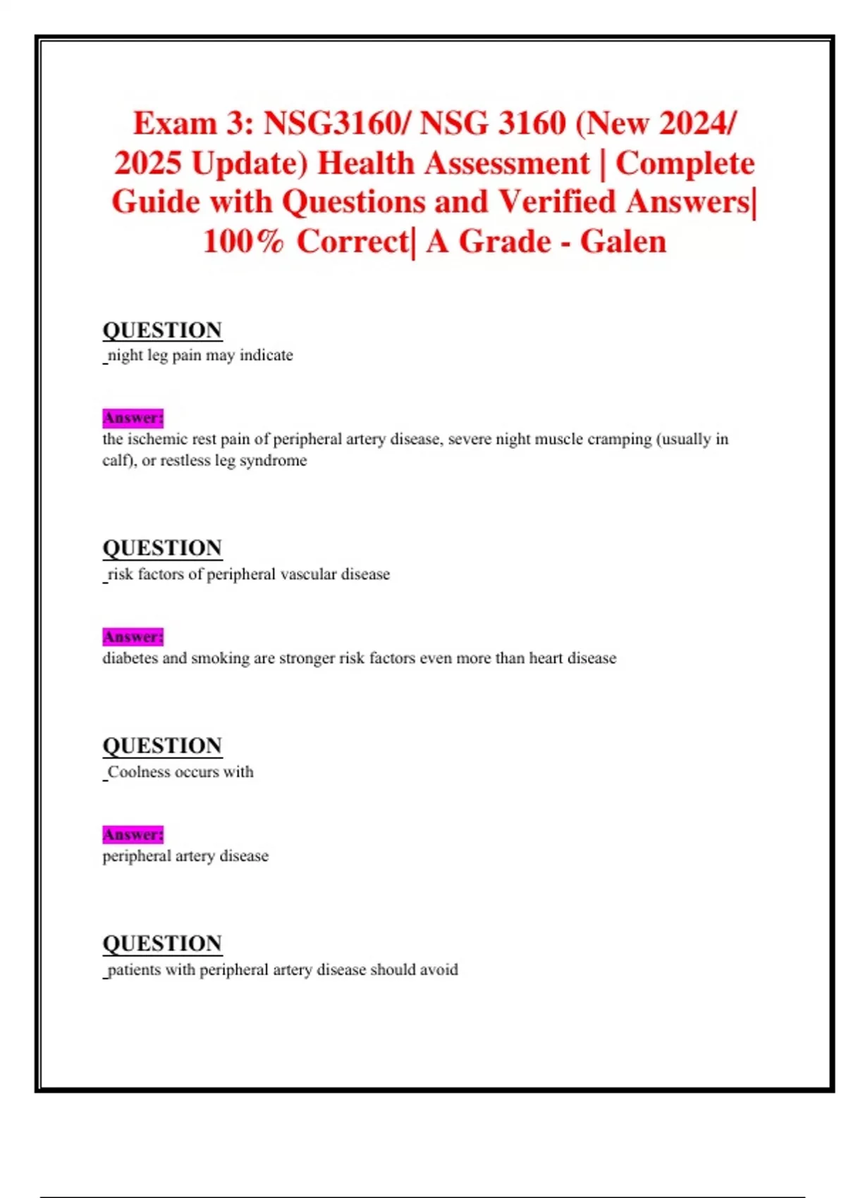 Exam 3: NSG3160/ NSG 3160 (New 2024/ 2025 Update) Health Assessment | Complete Guide with Questions and Verified Answers| 100% Correct| A Grade - Galen QUESTION night leg pain may indicate the ischemic rest pain of peripheral artery disease, severe night muscle cramping (usually in calf), or restless leg syndrome QUESTION risk factors of peripheral vascular disease Answer: diabetes and smoking are stronger risk factors even more than heart disease QUESTION Coolness occurs with Answer: peripheral artery disease QUESTION patients with peripheral artery disease should avoid Answer: compression stockings QUESTION If edema is bilateral, what does that indicate? Answer: systemic cause like heart failure QUESTION pitting and soft edema is usually found in Answer: bilaterally QUESTION If edema is unilateral, what does that indicate? Answer: local obstruction, inflammation or lymph node removal QUESTION with unilateral swelling, the edema is Answer: non-pitting and firm to the touch QUESTION enlarged lymph nodes occur with infection, malignancies, and immunologic di