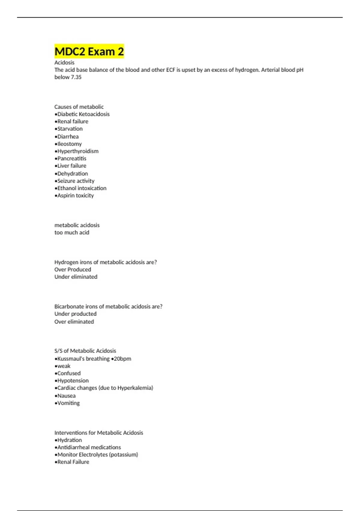MDC2 Exam 2 Acidosis The acid base balance of the blood and other ECF is upset by an excess of hydrogen. Arterial blood pH below 7.35 Causes of metabolic •Diabetic Ketoacidosis •Renal failure •Starvation •Diarrhea •Ileostomy •Hyperthyroidism •Pancreatitis •Liver failure •Dehydration •Seizure activity •Ethanol intoxication •Aspirin toxicity metabolic acidosis too much acid Hydrogen irons of metabolic acidosis are? Over Produced Under eliminated Bicarbonate irons of metabolic acidosis are? Under producted Over eliminated S/S of Metabolic Acidosis •Kussmaul's breathing •20bpm •weak •Confused •Hypotension •Cardiac changes (due to Hyperkalemia) •Nausea •Vomiting Interventions for Metabolic Acidosis •Hydration •Antidiarrheal medications •Monitor Electrolytes (potassium) •Renal Failure •Neuro status •DKA •Bicarbonate •Watch for Respiratory distress Lab assessment for metabolic acidosis SERUM POTASSIUM HIGH Respiratory Acidosis Respiratory function is impaired, causing problems with O2 and CO2 too much Co2 retained Respiratory Acidosis causes •COPD •SEVERE ASTHMA Acidosis Interprofessional collaborative care: •CNS changes Lethargy, confusion, stupor,coma Acidosis Interprofessional collaborative care: Neuromuscular changes ↓ Muscle tone, deep tendon reflexes, facial paralysis, skeletal muscle weakness Acidosis Interprofessional collaborative care: Respiratory changes Kussmaul's breathing Acidosis Interprofessional collaborative care: Skin changes Warm, dry, and pink (vasodilation) Acidosis Interprofessional collaborative care: Cardiovascular changes •Early: ↑ Heart rate, cardiac output changes Worsening: •Hyperkalemia; ↓ heart rate; T wave peaked and QRS widened; weak peripheral pulses; hypotension Priority problem for patient with respiratory acidosis Reduce GAS EXCHANGE resulting from underlying pulmonary disease. Interventions for Respiratory Acidosis •Focus on improving gas exchange •Administer Oxygen •If severe the patient may need to be put on a ventilator •Drug Therapies •Encourage breathing techniques Alkalosis a decrease in the free hydrogen ion level of the blood, arterial blood pH above 7.45. Metabolic Alkalosis Excessive intake of bicarbonates, carbonates, acetates, too much base Respiratory changes of metabolic alkalosis S/S •Increased rate and depth of ventilation (RA) •Decreased respiratory effort associated with skeletal muscle weakness (MA) Neuro changes of metabolic alkalosis S/S Hyperreflexia, muscle cramping, twitching, skeletal muscle weakness. Cardiovascular changes of metabolic alkalosis S/S Increased HR, normal or low blood pressure, increased digitalis toxicity. CNS changes of metabolic alkalosis Increased activity, Anxiety, Positive Chvostek's and Trousseau's sign, Paresthesias Interventions for Metabolic Alkalosis Treat the cause.... •Watch for respiratory distress •If Vomiting administer anti emetics (Zofran, phenergan) •Stop NG suctioning •Stop or alter dose of Diuretic •May administer Diamox (watch for hypokalemia) Hernia teaching POSToperative for patients getting LNF procedure • Soft diet for a week avoid carbonated beverages, tough foods, and raw vegetables that are difficult to swallow. • Take anti-reflux med for a month • No driving a week after surgery; do not drive if taking opioid pain medication. • walk, but no straining