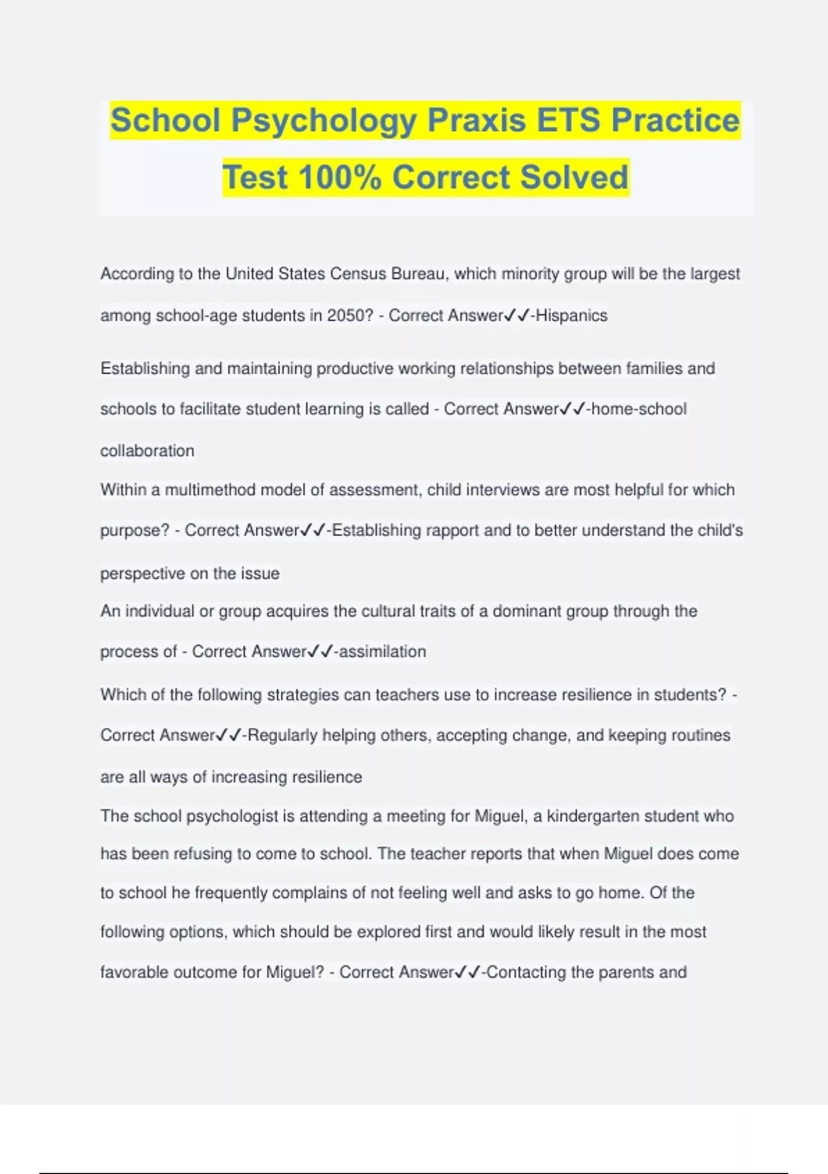 School Psychology Praxis ETS Practice Test 100% Correct Solved According to the United States Census Bureau, which minority group will be the largest among school-age students in 2050? - Correct Answer️️ -Hispanics Establishing and maintaining productive working relationships between families and schools to facilitate student learning is called - Correct Answer️️ -home-school collaboration Within a multimethod model of assessment, child interviews are most helpful for which purpose? - Correct Answer️️ -Establishing rapport and to better understand the child's perspective on the issue An individual or group acquires the cultural traits of a dominant group through the process of - Correct Answer️️ -assimilation Which of the following strategies can teachers use to increase resilience in students? - Correct Answer️️ -Regularly helping others, accepting change, and keeping routines are all ways of increasing resilience The school psychologist is attending a meeting for Miguel, a kindergarten student who has been refusing to come to school. The teacher reports that when Miguel does come to school he frequently complains of not feeling well and asks to go home. Of the following options, which should be explored first and would likely result in the most favorable outcome for Miguel? - Correct Answer️️ -Contacting the parents and discussing the situation may provide insight as to why the child is avoiding school, and will involve the parents as important members of the team observer drift - Correct Answer️️ -Any unintended change in the way an observer uses a measurement system over the course of an investigation that results in measurement error Which of the following is an example of observer drift? - Correct Answer️️ -A school psychologist unintentionally changes the standards being used to code a behavior over time. Ms. Mason is a school psychologist who is new to an area with a large Haitian population. She wants to ensure that she is culturally sensitive to the Haitian American students with whom she will be working. Which of the following is the most effective way for Ms. Mason to bridge the cultural gap? - Correct Answer️️ -Consult with a culture broker for advice and to facilitate interaction with the community Competence enhancement approaches are very effective for preventing substance abuse in schools because they - Correct Answer️️ -teach generic skills for coping with life Problem-solving skills that relate to adjustment - Correct Answer️️ -1. alternative- solutions thinking, or the ability to come up with unrelated solutions to a problem; 2. means-end thinking, or awareness of the intermediate steps required to achieve a particular goal; quential thinking, or the ability to identify what may happen as a direct result of acting in a particular way or choosing a particular solution; and causal thinking, or the ability to relate one event to another over time and to understand why one event led to a particular action. challenges that a school psychologist faces when assessing infants and toddlers