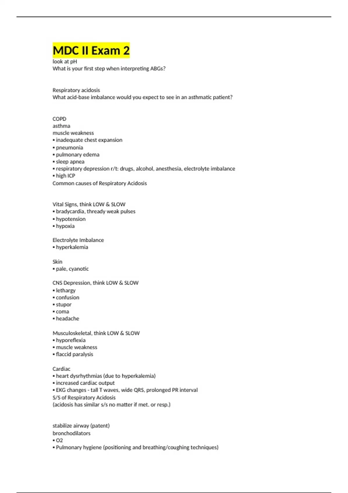 MDC II Exam 2 look at pH What is your first step when interpreting ABGs? Respiratory acidosis What acid-base imbalance would you expect to see in an asthmatic patient? COPD asthma muscle weakness ▪ inadequate chest expansion ▪ pneumonia ▪ pulmonary edema ▪ sleep apnea ▪ respiratory depression r/t: drugs, alcohol, anesthesia, electrolyte imbalance ▪ high ICP Common causes of Respiratory Acidosis Vital Signs, think LOW & SLOW ▪ bradycardia, thready weak pulses ▪ hypotension ▪ hypoxia Electrolyte Imbalance ▪ hyperkalemia Skin ▪ pale, cyanotic CNS Depression, think LOW & SLOW ▪ lethargy ▪ confusion ▪ stupor ▪ coma ▪ headache Musculoskeletal, think LOW & SLOW ▪ hyporeflexia ▪ muscle weakness ▪ flaccid paralysis Cardiac ▪ heart dysrhythmias (due to hyperkalemia) ▪ increased cardiac output ▪ EKG changes - tall T waves, wide QRS, prolonged PR interval S/S of Respiratory Acidosis (acidosis has similar s/s no matter if met. or resp.) stabilize airway (patent) bronchodilators ▪ O2 ▪ Pulmonary hygiene (positioning and breathing/coughing techniques) ▪ Suction PRN ▪ If on ventilation, increase ventilation rate. ▪ Endotracheal intubation For underlying causes: ▪ Correct electrolyte balance (hyperkalemia) ▪ Antibiotics (if it's infection) Treatment for Respiratory Acidosis ▪ increase respirations to increase pH What does your body do to compensate for respiratory acidosis? ▪ impaired gas exchange Nursing Diagnosis for Respiratory Acidosis respiratory acidosis low pH, high CO2 metabolic acidosis low pH, low HCO3 respiratory alkalosis high pH, low CO2 metabolic alkalosis high pH, high HCO3 Uncompensated pH and one other value are abnormal. Fully compensated pH is normal, but the other 2 are abnormal. Partially compensated all 3 values are abnormal overproduction of hydrogen ions aspirin toxicity ▪ kidney failure, liver failure, pancreatitis ▪ diarrhea (ACI-dosis sounds like ASS) ▪ dehydration ▪ ingestion of acids: ethanol, methanol, salicylate acid ▪ lactic acidosis ▪ diabetic ketoacidosis, starvation ▪ hypermetabolism: excessive exercises, seizures, fever, hypoxia Causes of Metabolic Acidosis Vital Signs, think LOW & SLOW Kussmaul respirations ▪ bradycardia, thready weak pulse ▪ hypotension ▪ hypoxia Electrolyte Imbalances ▪ hyperkalemia ▪ hyperglycemia (if the cause is DKA) Skin ▪ warm, flushed, dry (due to vasodilation) CNS depression, think LOW and SLOW ▪ lethargy ▪ confusion ▪ stupor ▪ coma ▪ Headache Musculoskeletal, think LOW and SLOW ▪ hyporeflexia ▪ muscle weakness ▪ flaccid paralysis Cardiac ▪ heart dysrhythmias (due to hyperkalemia) ▪ increased cardiac output ▪ EKG changes - tall T waves, wide QRS, prolonged PR interval S/S of Metabolic Acidosis (acidosis has similar s/s no matter if met. or resp.) Peaked T waves Wide QRS Prolonged PR interval How does the EKG change for a patient with metabolic acidosis? administer sodium bicarbonate ▪ insulin (if cause is DKA) ▪ fluid/electrolyte replacement (remember some causes are dehydration/diarrhea) ▪ treat underlying cause... Treatment for Metabolic Acidosis Mechanical ventilation question will ask which intervention is NOT included in treatment for Metabolic Acidosis Mechanical ventilation Treat underlying cause Fluid replenishment I & O ▪ Monitor ABGs, electrolytes (especially potassium) ▪ Monitor neuro status for decline ▪ Monitor I&O ▪ Perform skin assessment ▪ Seizure precautions ▪ Provide periods of rest ▪ Provide oral care Nursing Interventions for Metabolic Acidosis excessive loss of CO2 from hyperventilation (tachypnea) ▪ fear ▪ anxiety ▪ shock ▪ high altitude ▪ fever ▪ embolism ▪ aspirin toxicity ▪ salicylate toxicity ▪ mechanical ventilation: improper vent settings ▪ early stage acute pulmonary problems Causes of Respiratory Alkalosis Vital Signs ▪ Tachycardia ▪ Tachypnea ▪ Normal or low BP (hypotension) ▪ Fever (if that's a cause) ▪ Increased rate and depth of ventilation (fast RR) Electrolytes ▪ Hypocalcemia ▪ Hypokalemia CNS Excitement ▪ increased activity ▪ anxiety ▪ irritability ▪ tetany ▪ seizures Musculoskeletal ▪ Hyperreflexia: - Positive Chvostek's sign - Positive Trousseau's sign ▪ Muscle cramps/weakness/twitching ▪ Parathesia Cardiac