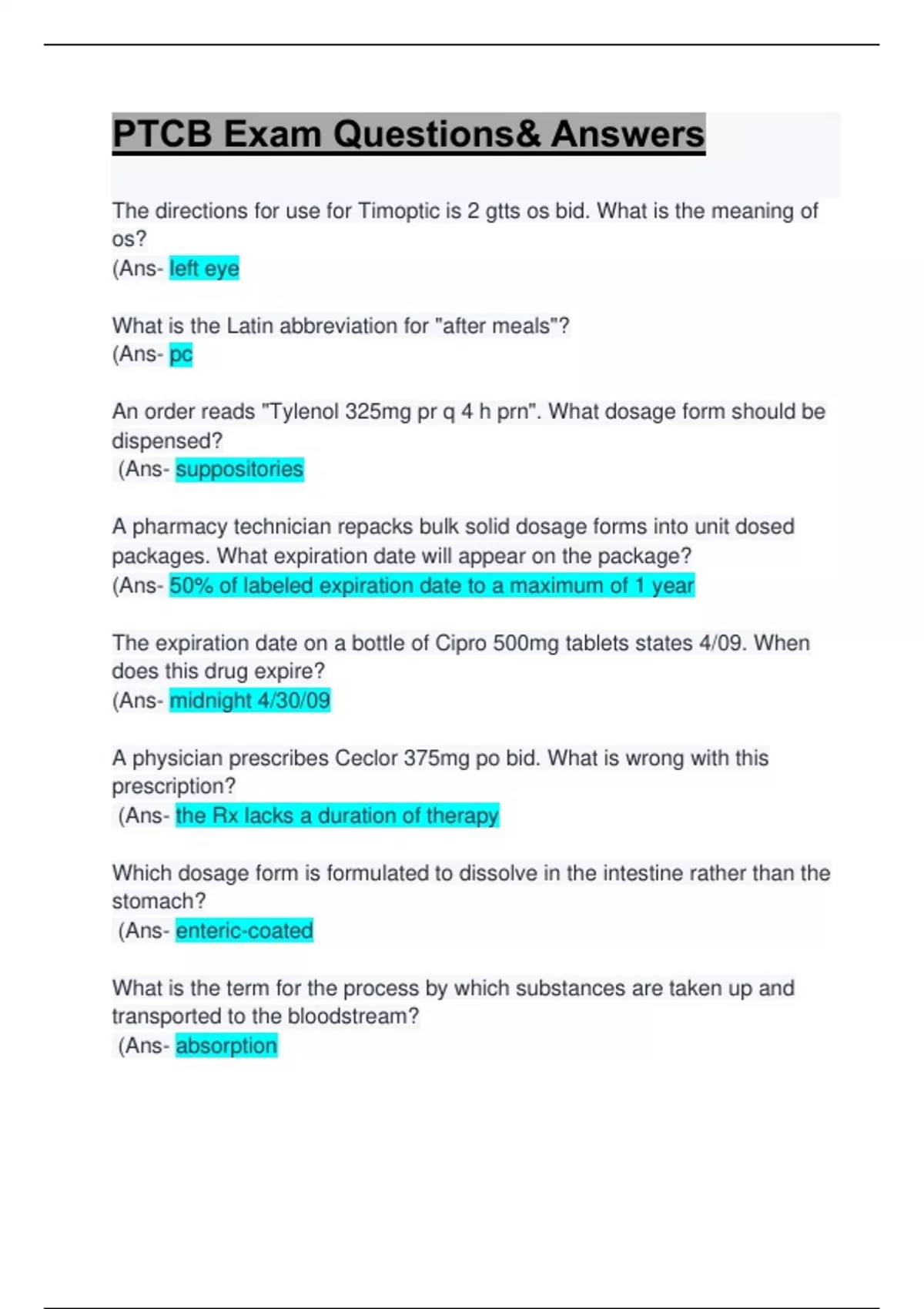 The directions for use for Timoptic is 2 gtts os bid. What is the meaning of os? (Ans- left eye What is the Latin abbreviation for "after meals"? (Ans- pc An order reads "Tylenol 325mg pr q 4 h prn". What dosage form should be dispensed? (Ans- suppositories A pharmacy technician repacks bulk solid dosage forms into unit dosed packages. What expiration date will appear on the package? (Ans- 50% of labeled expiration date to a maximum of 1 year The expiration date on a bottle of Cipro 500mg tablets states 4/09. When does this drug expire? (Ans- midnight 4/30/09 A physician prescribes Ceclor 375mg po bid. What is wrong with this prescription? (Ans- the Rx lacks a duration of therapy Which dosage form is formulated to dissolve in the intestine rather than the stomach? (Ans- enteric-coated What is the term for the process by which substances are taken up and transported to the bloodstream? (Ans- absorption What is "room temperature" (Ans- 15-30 degrees Centigrade The process whereby a drug is transformed by the liver is referred to as; (Ans- metabolism