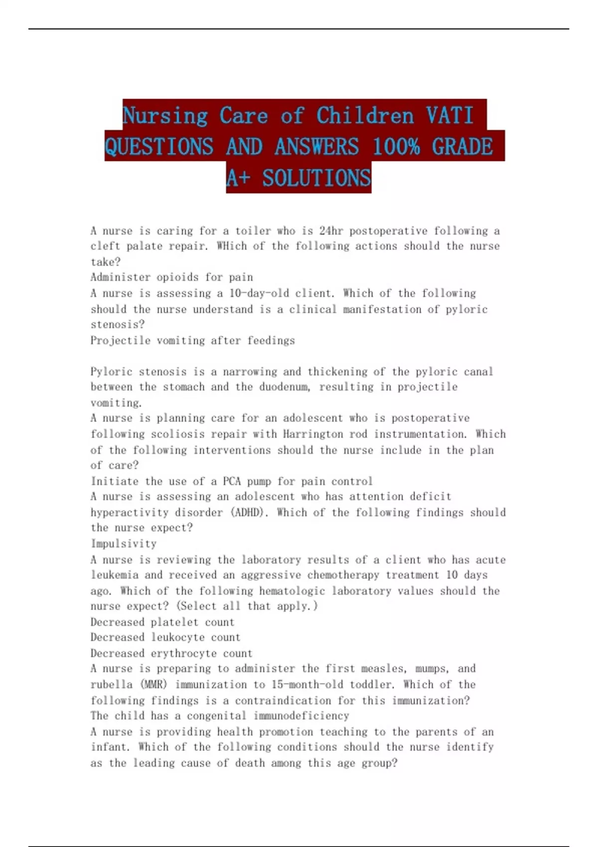 Nursing Care of Children VATI QUESTIONS AND ANSWERS 100% GRADE A+ SOLUTIONS