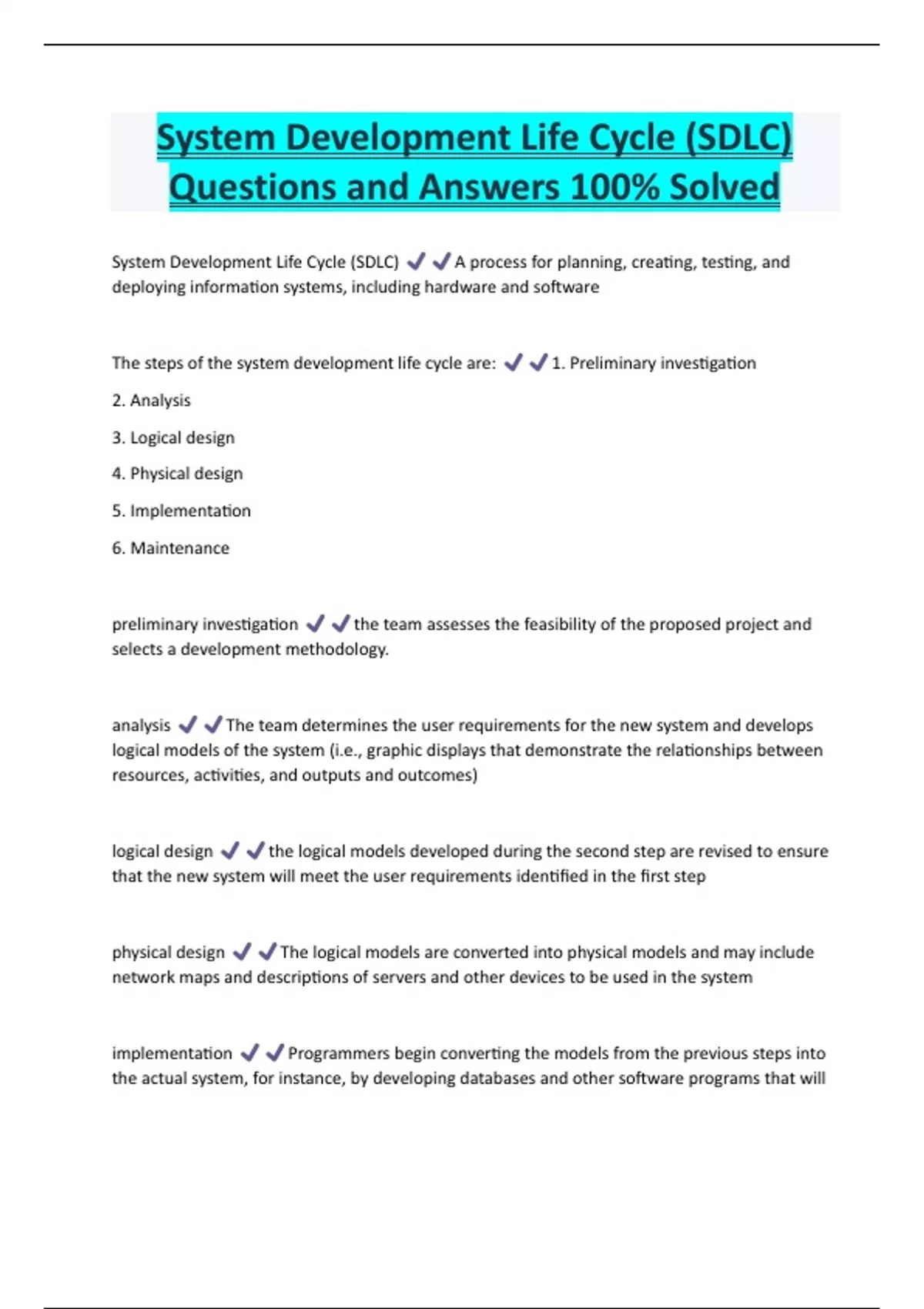 System Development Life Cycle (SDLC) Questions and Answers 100% Solved System Development Life Cycle (SDLC) A process for planning, creating, testing, and deploying information systems, including hardware and software The steps of the system development life cycle are: 1. Preliminary investigation 2. Analysis 3. Logical design 4. Physical design 5. Implementation 6. Maintenance preliminary investigation the team assesses the feasibility of the proposed project and selects a development methodology. analysis The team determines the user requirements for the new system and develops logical models of the system (i.e., graphic displays that demonstrate the relationships between resources, activities, and outputs and outcomes) logical design the logical models developed during the second step are revised to ensure that the new system will meet the user requirements identified in the first step physical design The logical models are converted into physical models and may include network maps and descriptions of servers and other devices to be used in the system