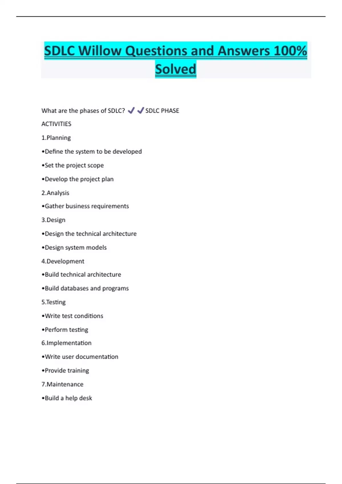 SDLC Willow Questions and Answers 100% Solved What are the phases of SDLC? SDLC PHASE ACTIVITIES 1.Planning •Define the system to be developed •Set the project scope •Develop the project plan 2.Analysis •Gather business requirements 3.Design •Design the technical architecture •Design system models 4.Development •Build technical architecture •Build databases and programs 5.Testing •Write test conditions •Perform testing 6.Implementation •Write user documentation •Provide training