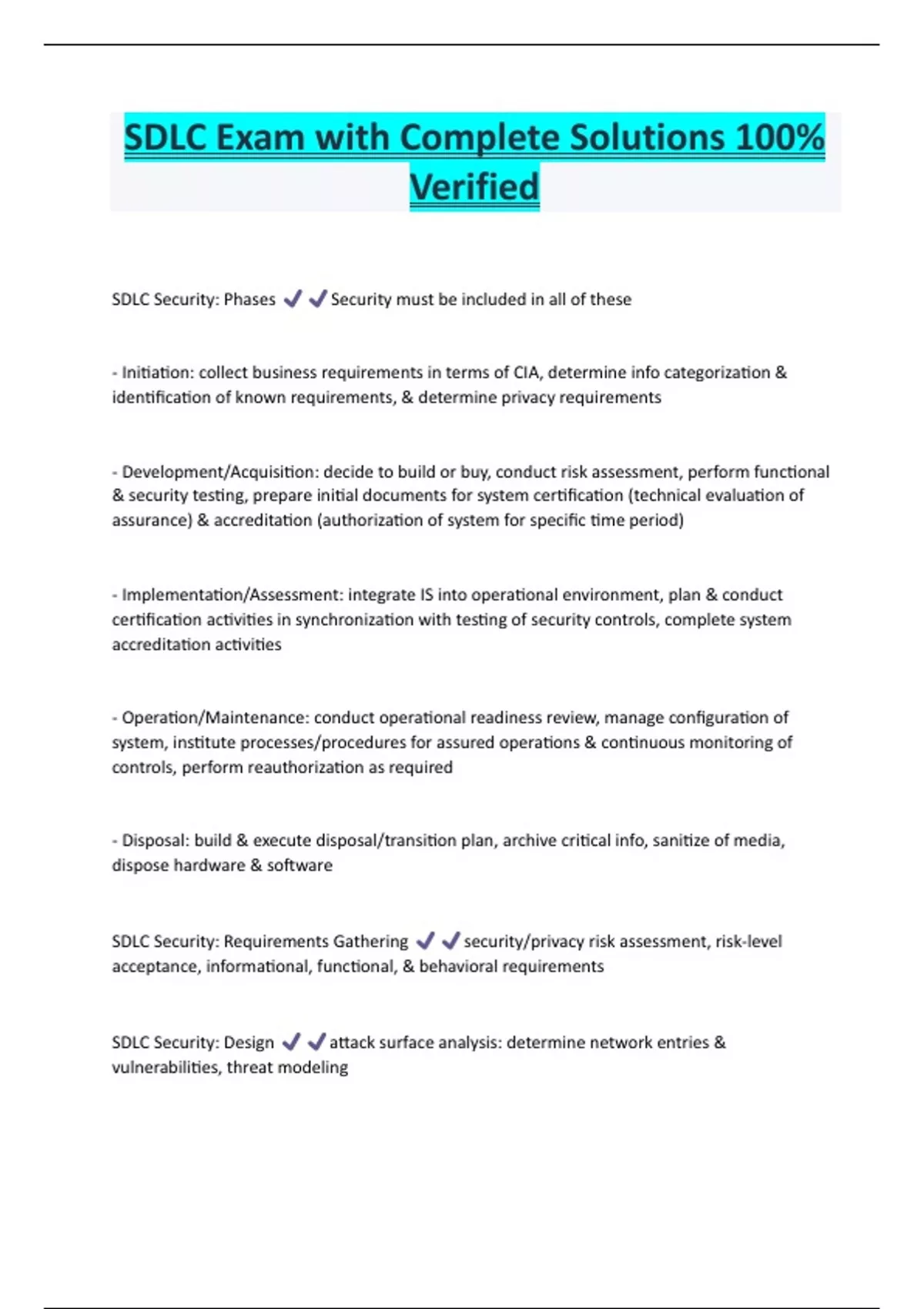 SDLC Exam with Complete Solutions 100% Verified SDLC Security: Phases Security must be included in all of these - Initiation: collect business requirements in terms of CIA, determine info categorization & identification of known requirements, & determine privacy requirements - Development/Acquisition: decide to build or buy, conduct risk assessment, perform functional & security testing, prepare initial documents for system certification (technical evaluation of assurance) & accreditation (authorization of system for specific time period) - Implementation/Assessment: integrate IS into operational environment, plan & conduct certification activities in synchronization with testing of security controls, complete system accreditation activities